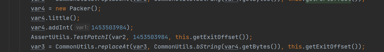 更新退出条件(Exit Offset):重新初始化 Packer 对象,并使用 addInt() 方法添加一个整型值 1453503984(可能是某种退出标志或函数指针的地址)。