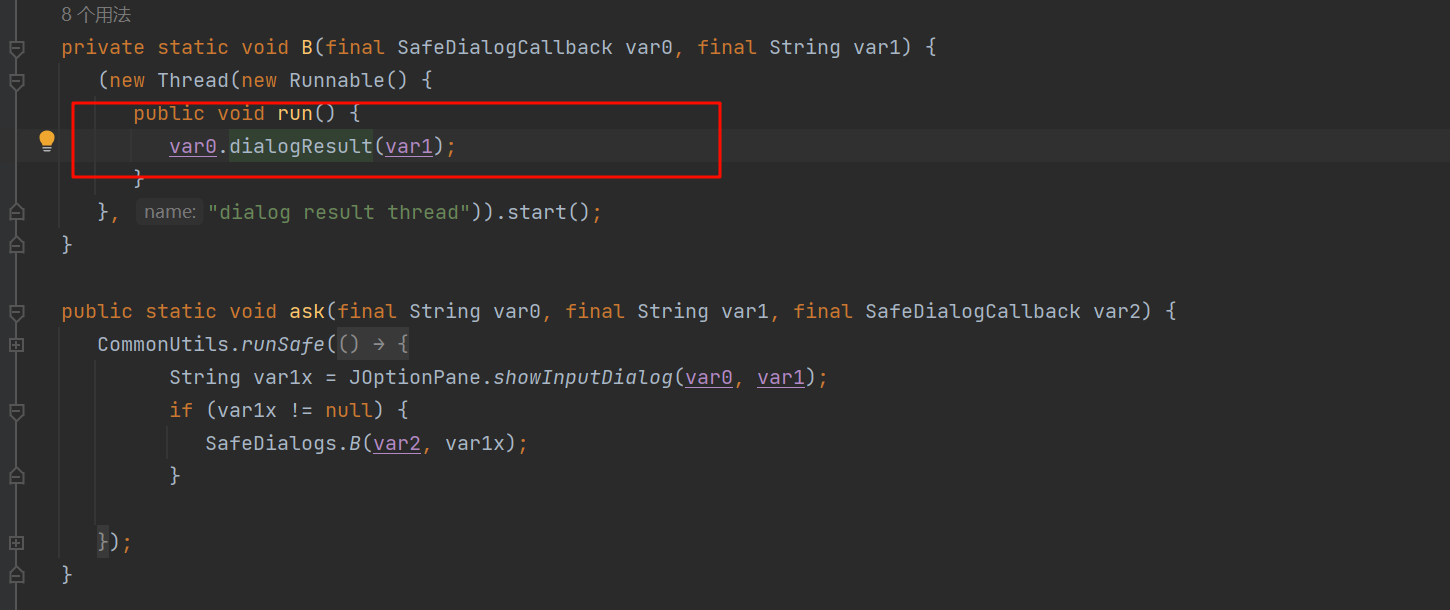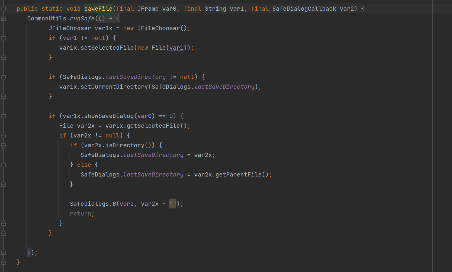 我们来分析一下SafeDialogs.saveFile()的内部实现,这个方法用于在 GUI 应用程序中打开一个保存文件的对话框,并处理用户的文件选择。这一部分代码很好懂,我们看最后一段代码SafeDialogs.B(var2, var2x + "");