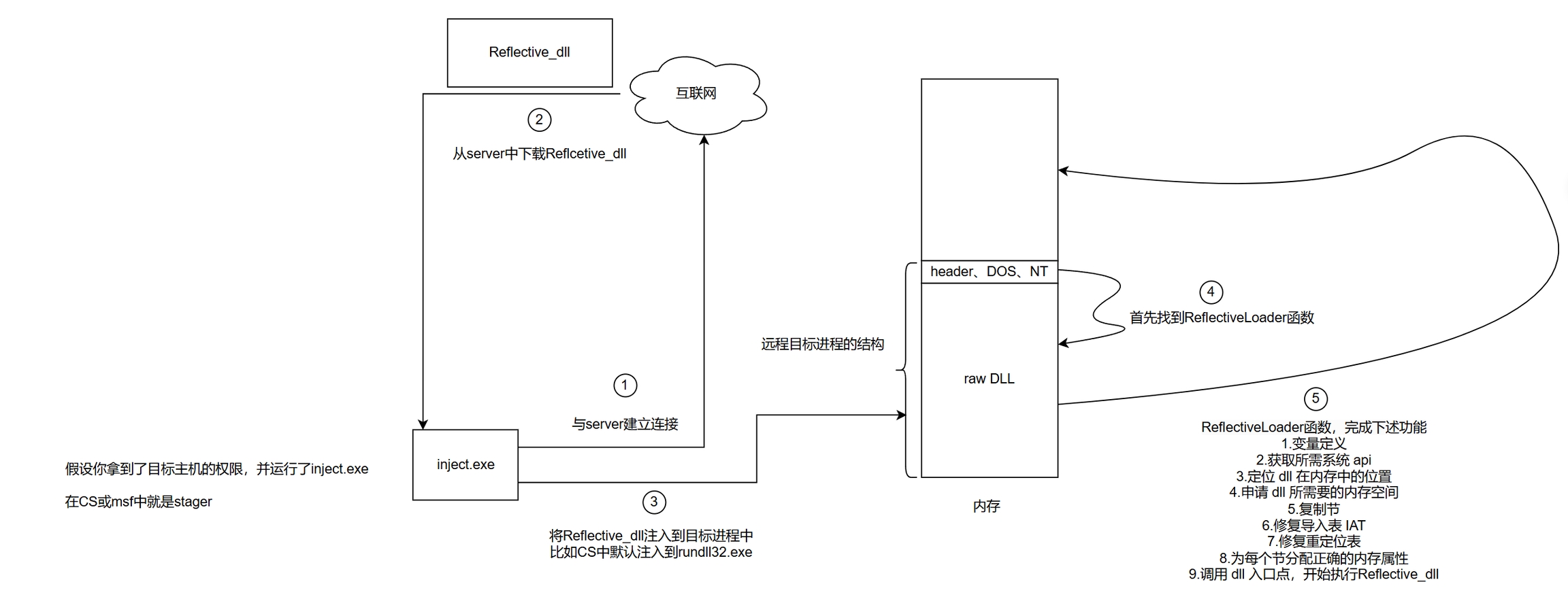 CobaltStrike的stager的工作原理:stager要负责按照HTTP Host(Stager)的IP将beacon的pe文件(通常是beacon.dll)从server下载下来,然后通过PELoader将beacon.dll加载到内存并执行,这个PELoader在CobaltStrikes具体实现是反射型dll注入(Reflective dll inject)