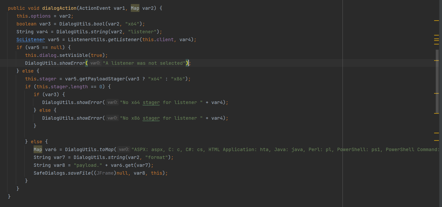 分析过后,我对ListenerUtils的getListener()、和ScListener类的getPayloadStager()、SafeDialogs.saveFile()这三个方法感到好奇,所以我们转到函数实现处,看看具体实现