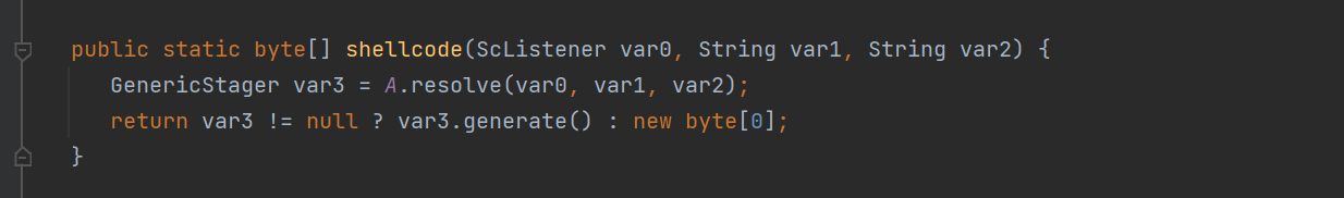 A.resolve解析生成GenericStager对象。GenericStager是一个用于生成 shellcode 的对象,通常与监听器相关联。它可能根据监听器的配置生成特定的 shellcode,允许目标系统反向连接到攻击者的服务器。然后调用了