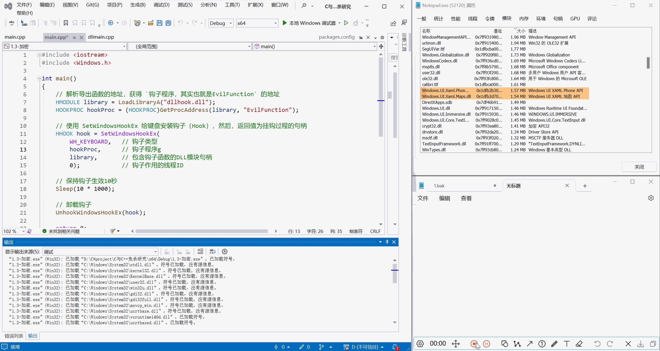 由于键盘事件是 hooked 的,打字后会触发我们的钩子,notepad.exe 会加载我们的恶意 dll 并调用导出的函数