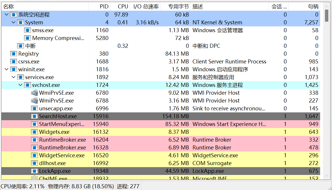 通过ProcessHacker、ProcessExplorer、ProcessMonitor等工具可查看进程所属session。