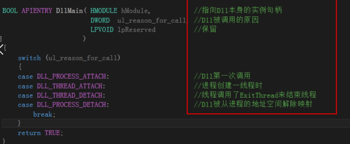 解释一下代码,DllMain,这是 DLL 的入口点,暂时用不到dll编写导出函数,我们只需要DllMain函数就可以了。当 ur_reason_for_call 满足下列几种情况时会执行相应的代码(需要自己添加)
