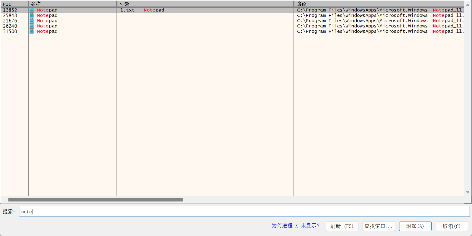 可以通过菜单"文件"->"附加"(或者按下快捷键Alt+A)会弹出如下图所示的附加对话框,读者只需要选中一个正在运行的程序即可附加到特定进程内
