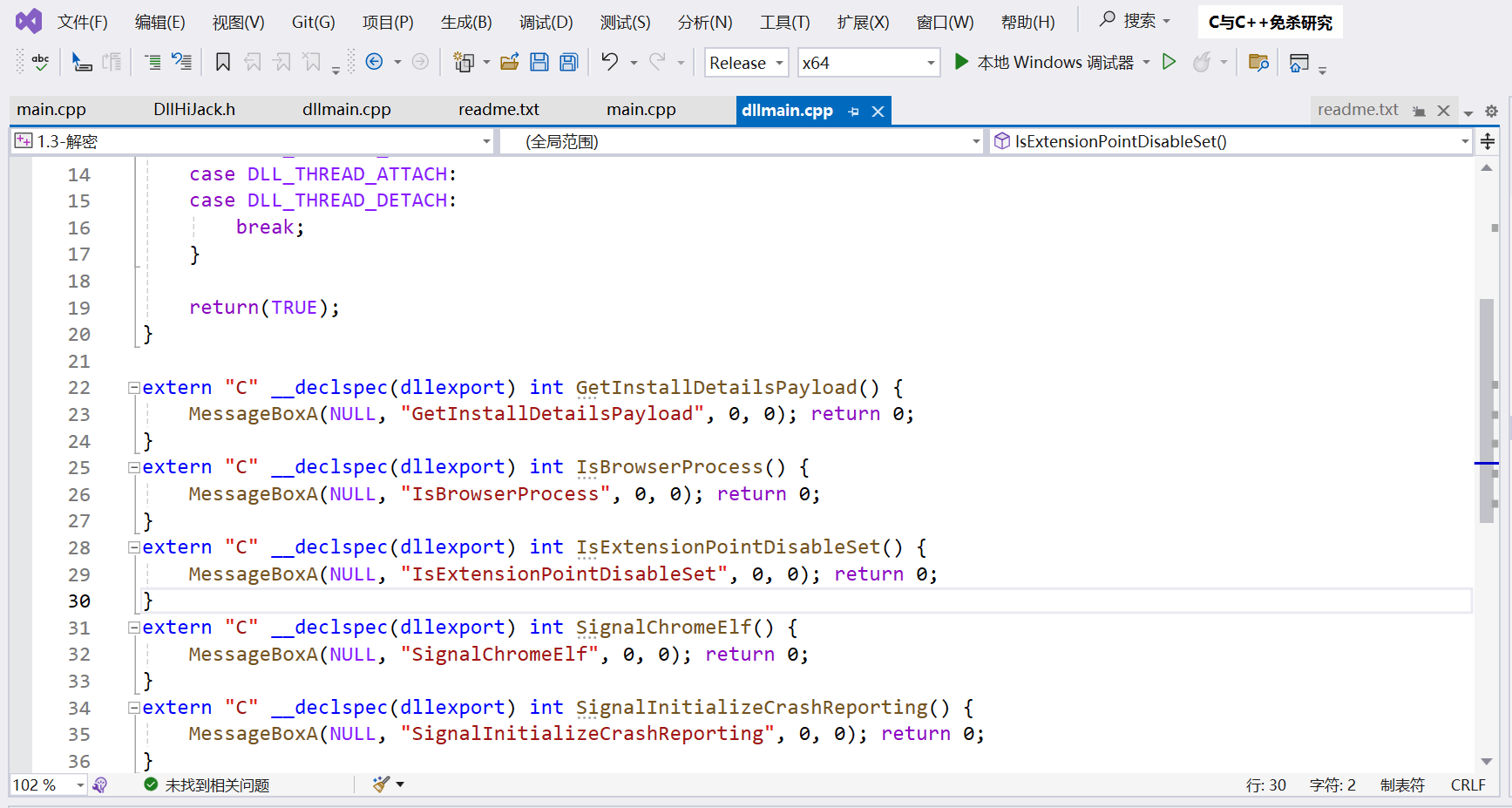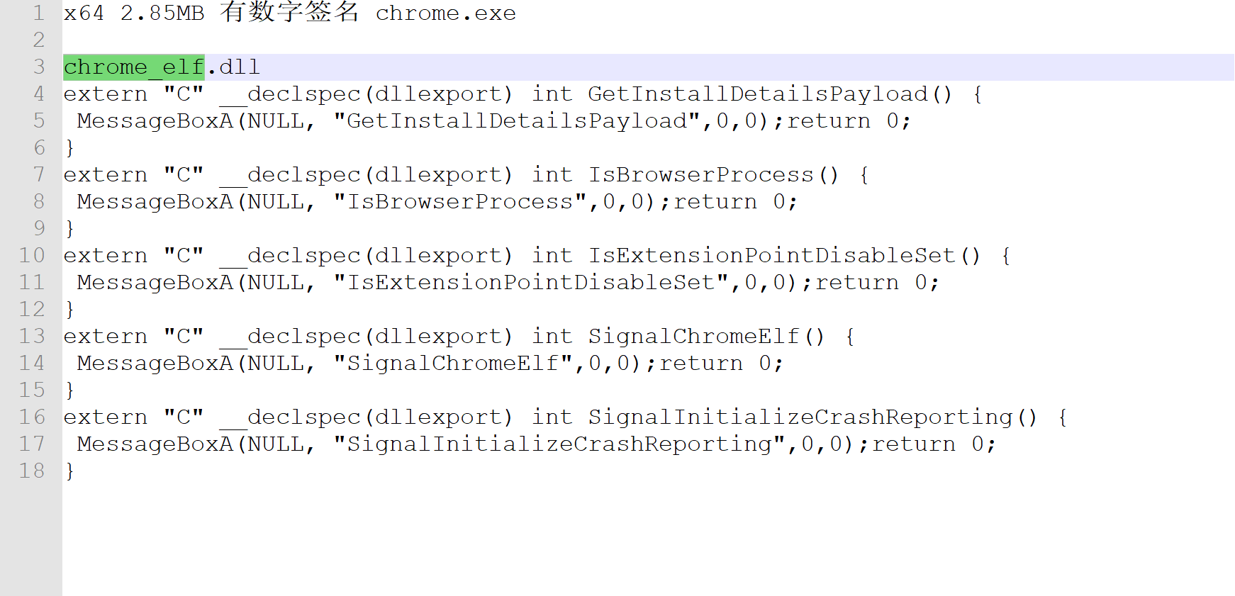 随便打开一个输出结果的txt,看看里面的导出函数声明,然后将代码复制到VS编译成一个恶意DLL,将恶意DLL的名称修改为 chrome_elf.dll