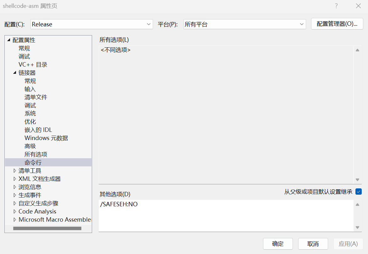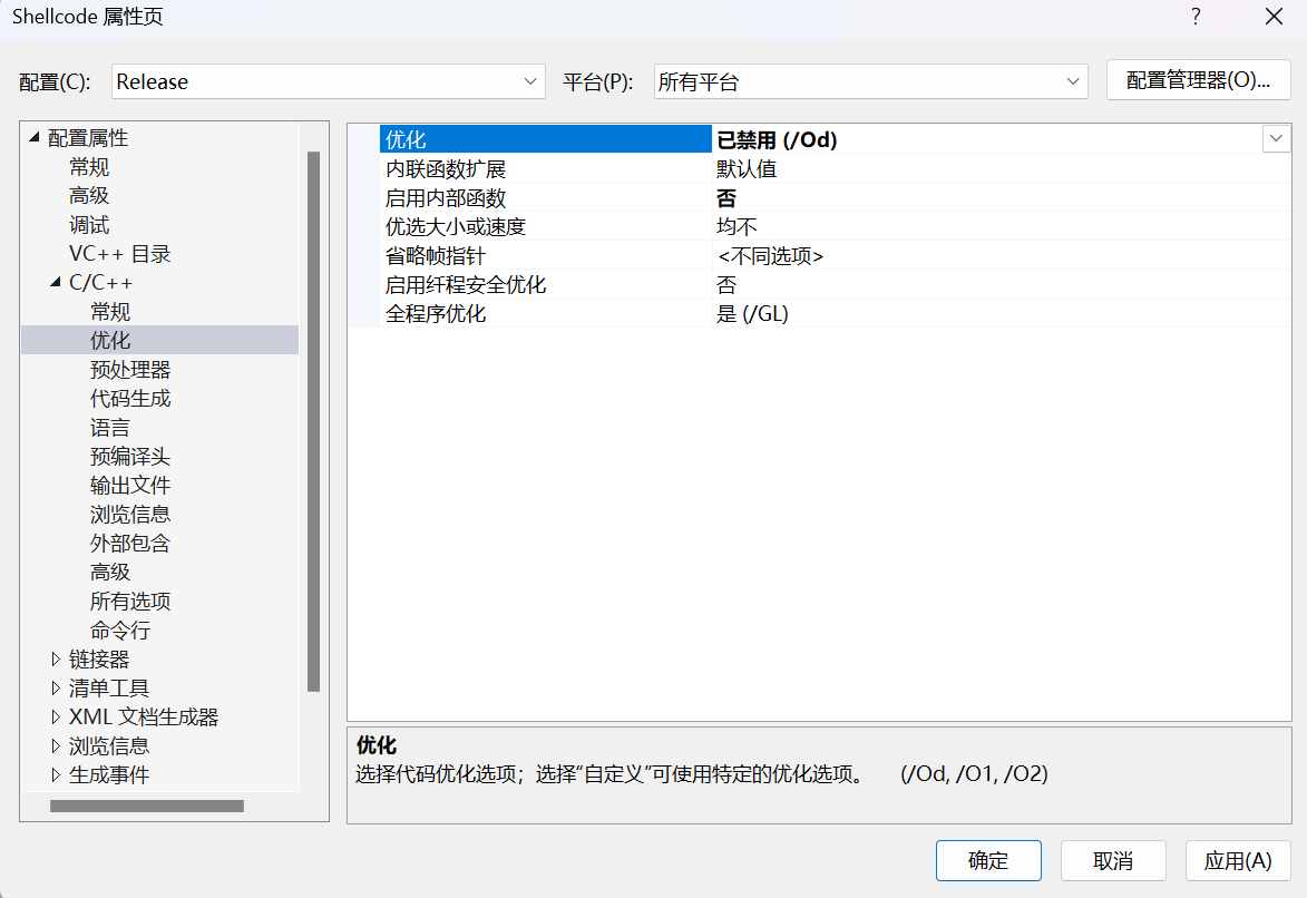 关闭优化(最小优化可以使生成shellcode的体积减小,但不能保证正常运行),启用内部函数选项改为否