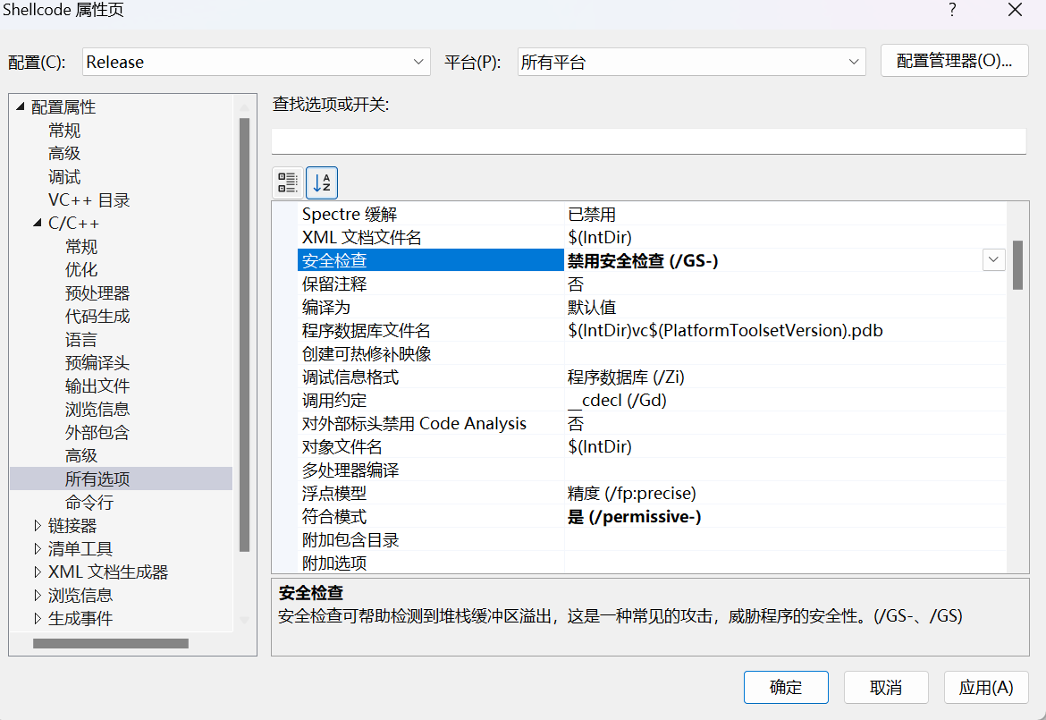 首先我们要关闭安全检查,因为启用安全检查后,会使用到security cookie这个全局变量,但是我们shellcode压根不能用.rdata的全局变量所以要关闭这个选项。