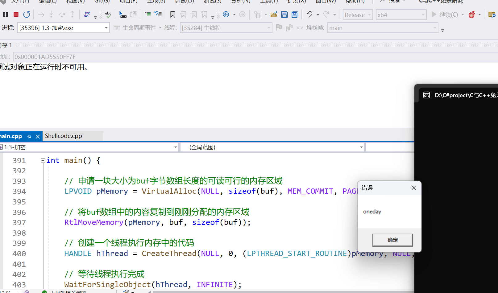 然后用各种加载器来完成加载,这里我使用创建线程的方式执行shellcode