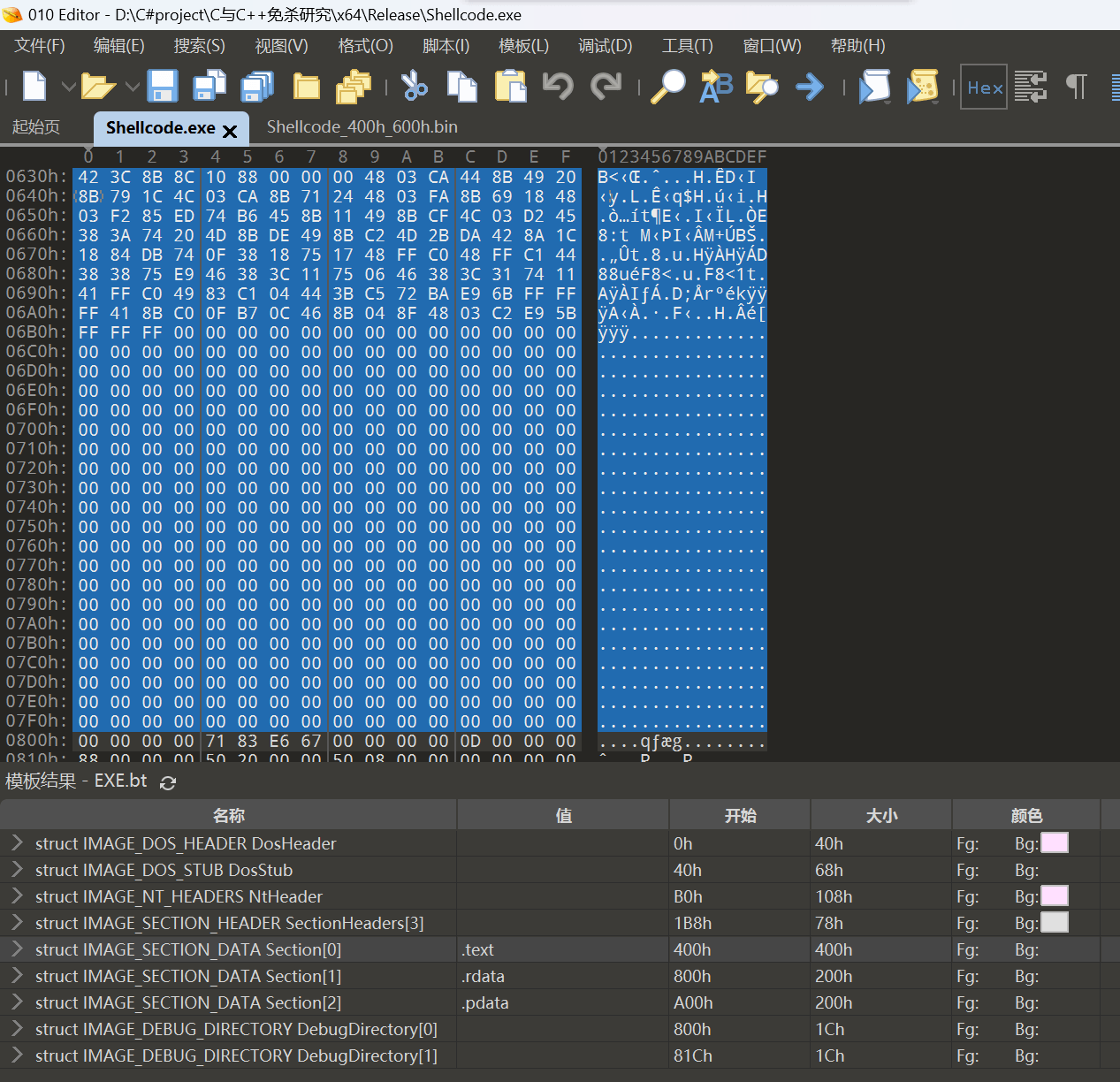 想要解析pe文件,需要在010editor的模板处安装 EXE.bt 模板才能达到下图所示的效果。可以看到末尾有很多00字节,我尝试去掉一些也能够正常执行。