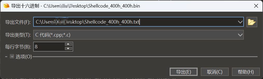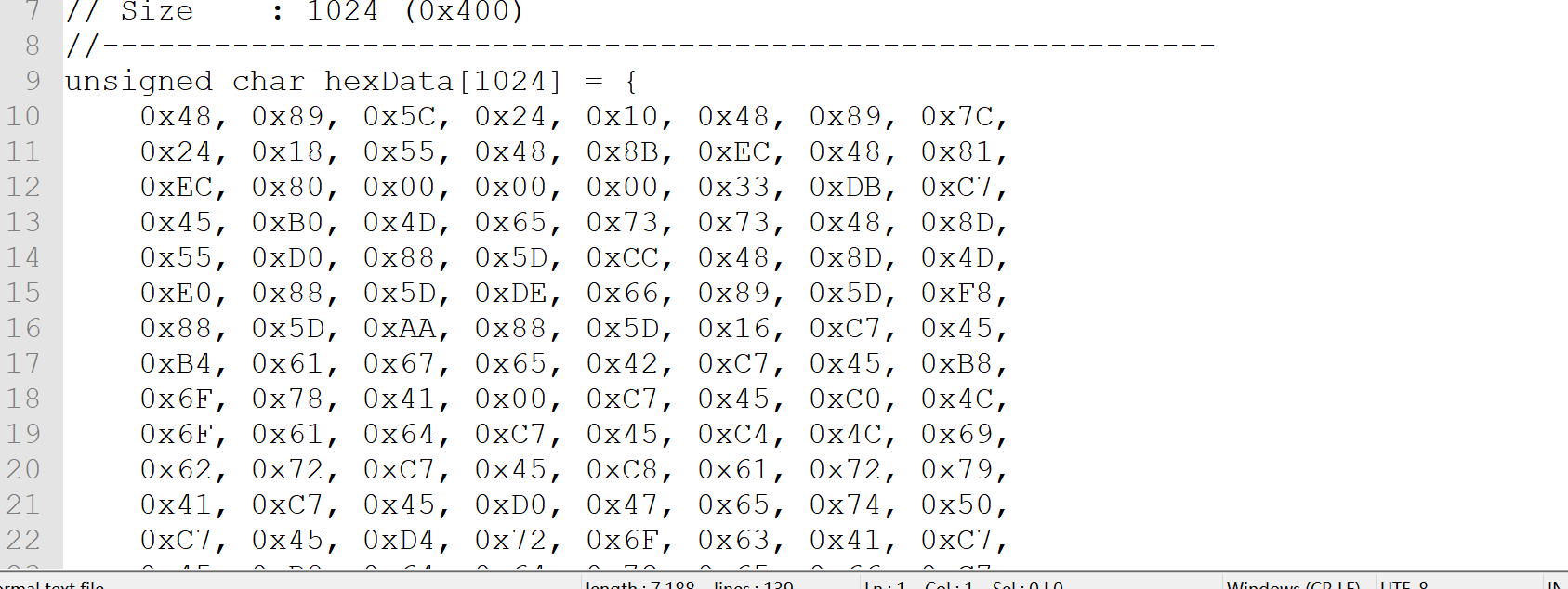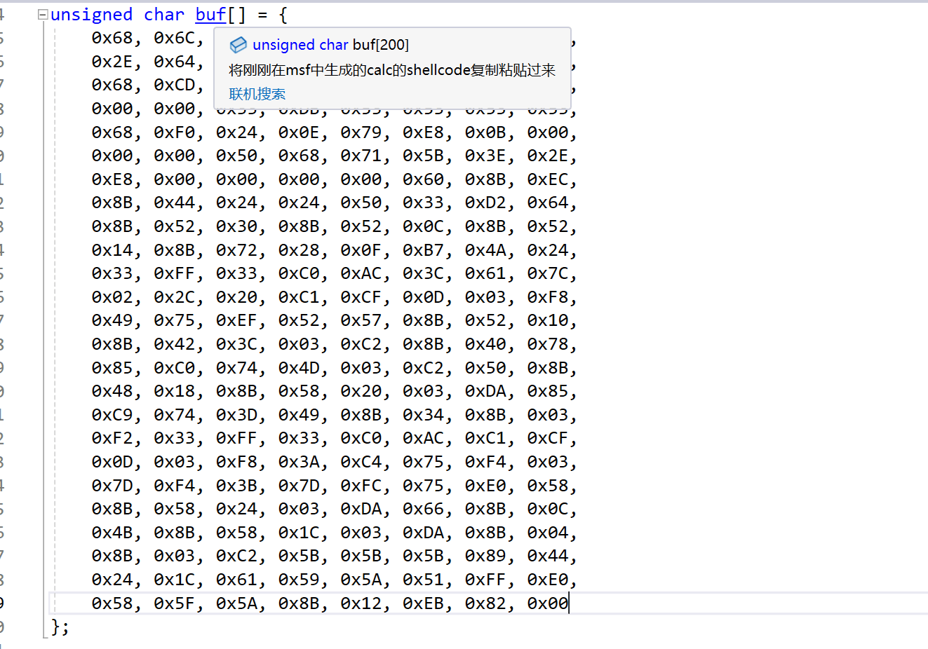 将生成的bin文件转换为C语言格式,去掉末尾一大串'00',只保留一个'00',可以明显的看到我们的shellcode体积是如此之小