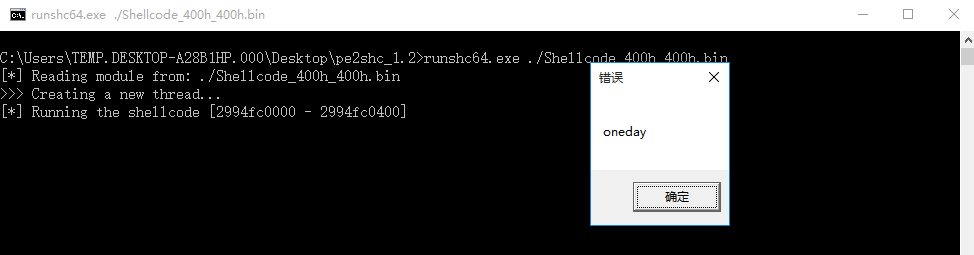 按照4.1介绍的步骤,我们提取编译后exe文件中的.text节的机器码作为我们的shellcode,然后用runshc64.exe工具运行*.bin文件。