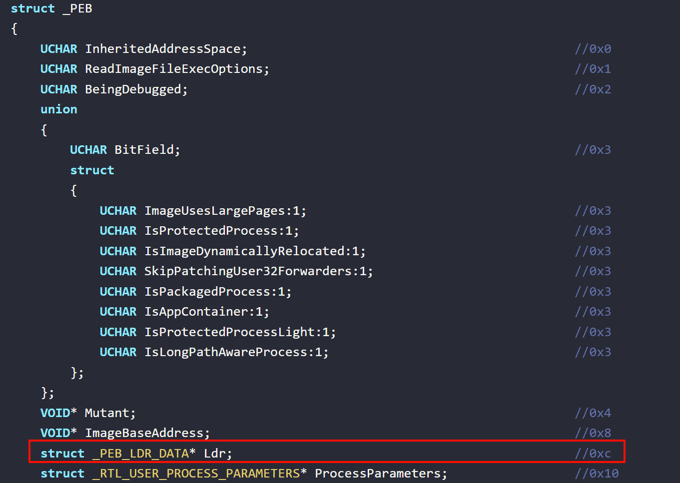 mov edx,[edx+0ch]:获取ldr指针。在PEB结构体偏移0xc则存放着PEB_LDR_DATA结构体的指针
