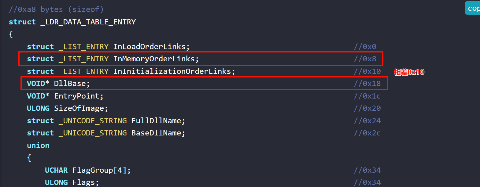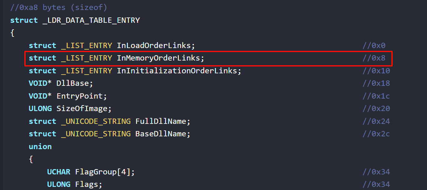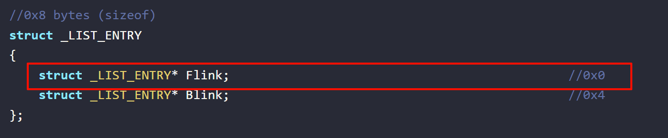 Flink 指针指向下一个节点,有没有人好奇它指向的具体位置在哪里呢?根据我的分析,它其实指向的是 LDR_DATA_TABLE_ENTRY 结构体0x8的位置上