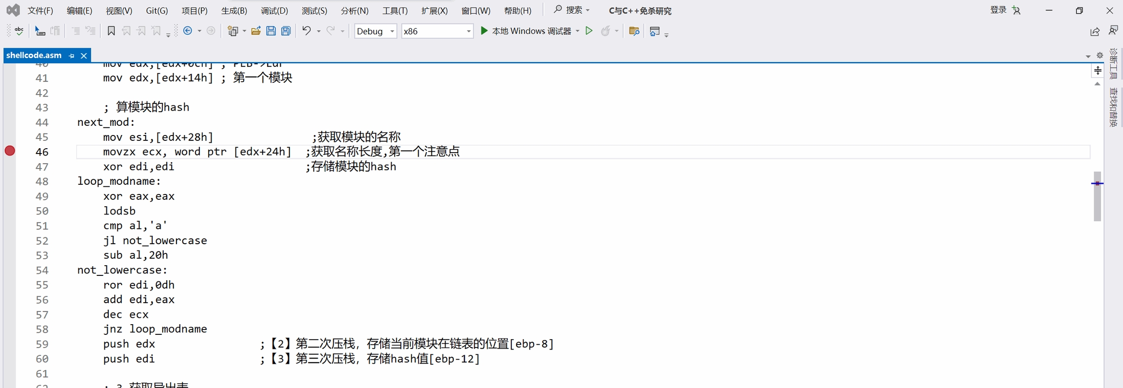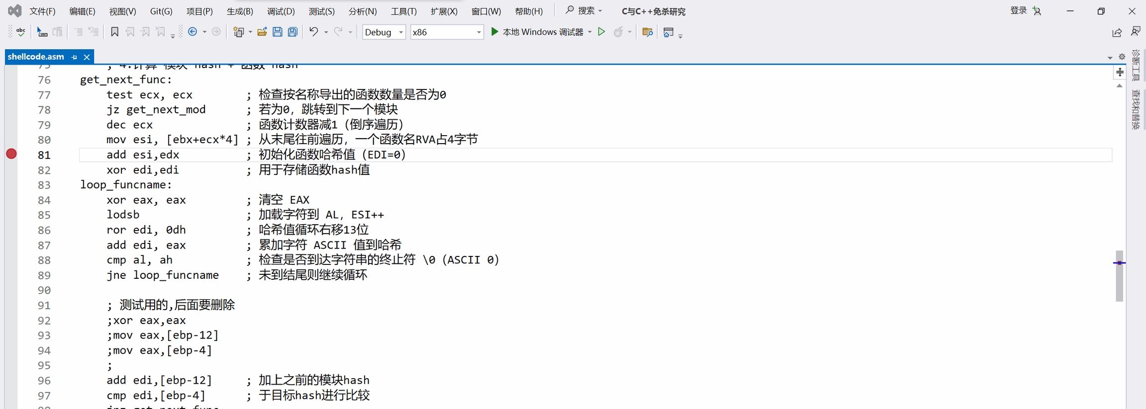 我将 block_api.asm 的api_call命名为GetProcAddressByHash,保持了大部分代码的原样,并对少部分代码进行了修改