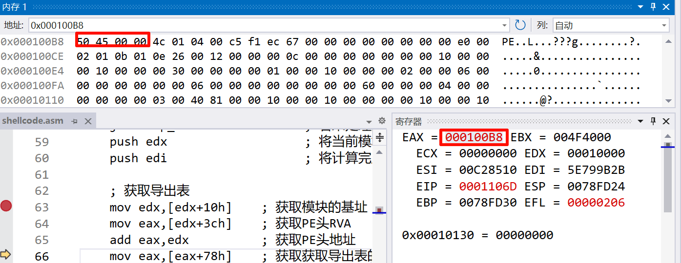 mov eax,[edx+3ch]:获取PE头RVA,从这条指令开始都是涉及PE头的操作。