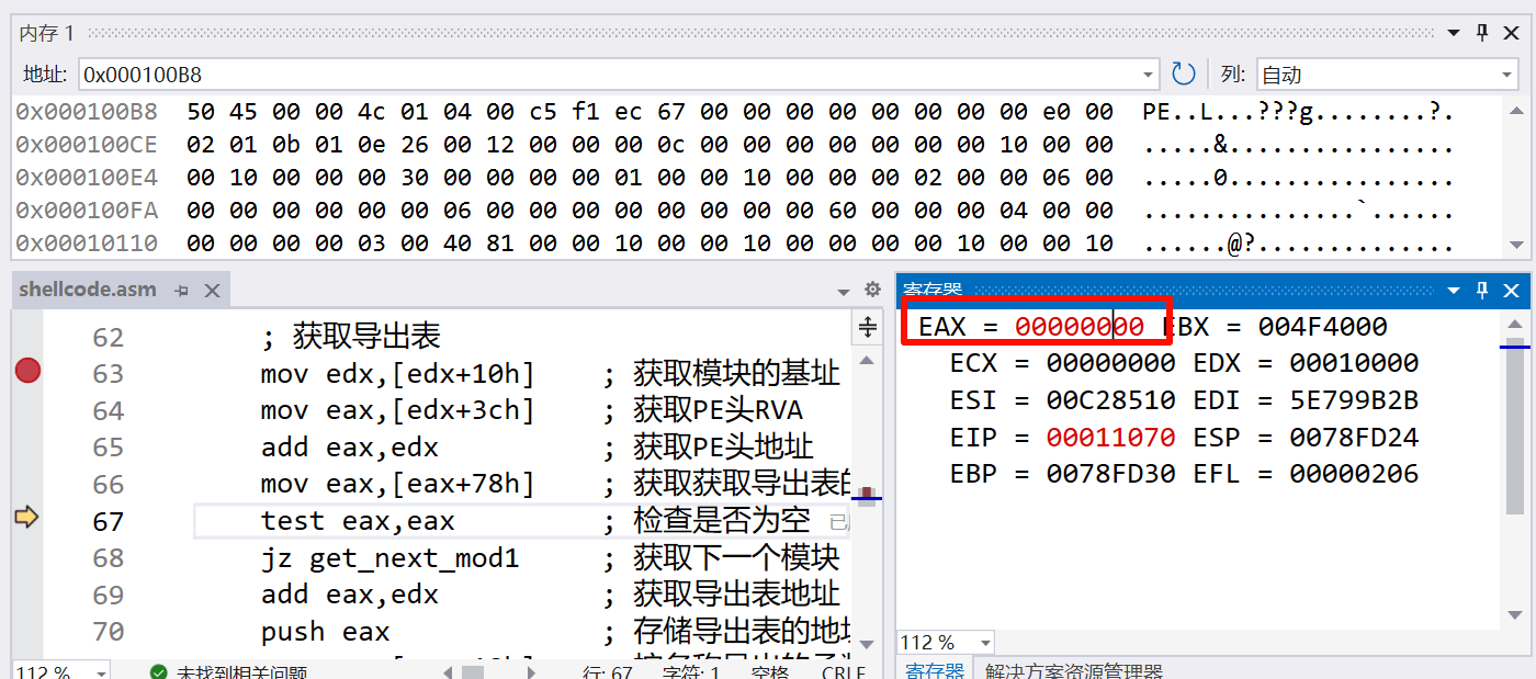 CHAR VirtualAlloc[] = "VirtualAlloc";的常量字符串是不允许的。但话也不能说的这么绝对,如果能保证文件对齐和内存对齐相同,也就可以带上.rdata节的数据,但我感觉太麻烦了。不能使用导入表:如果需要用到Windows的API,就需要通过PEB来动态获取或者可以先用PEB获取