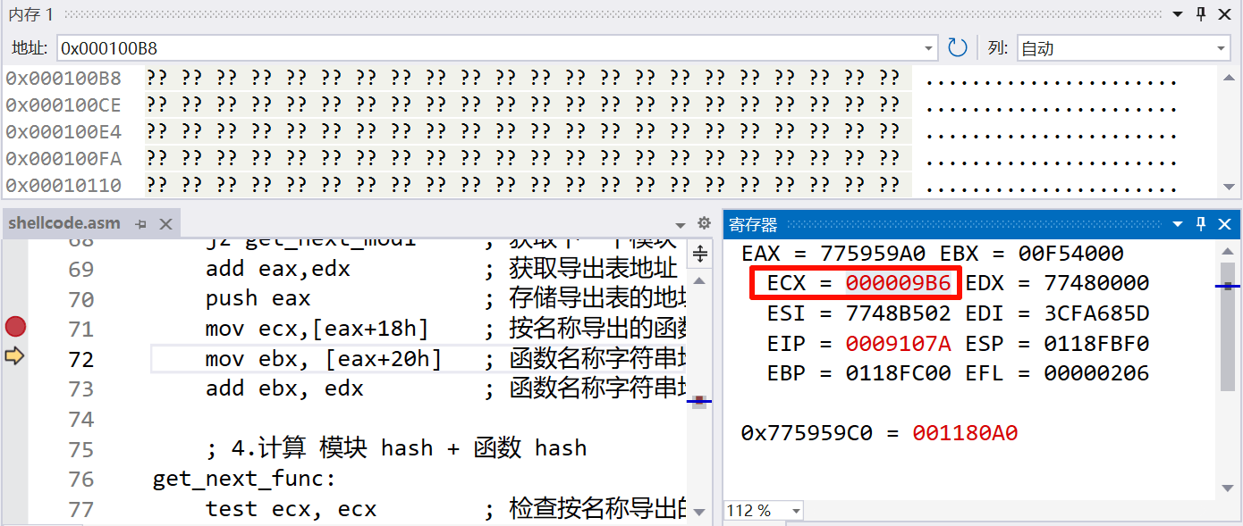 mov ecx,[eax+18h]和mov ebx, [eax+20h]:获取按名称导出的函数数量和函数名称字符串地址数组的RVA(AddressOfNames RVA)