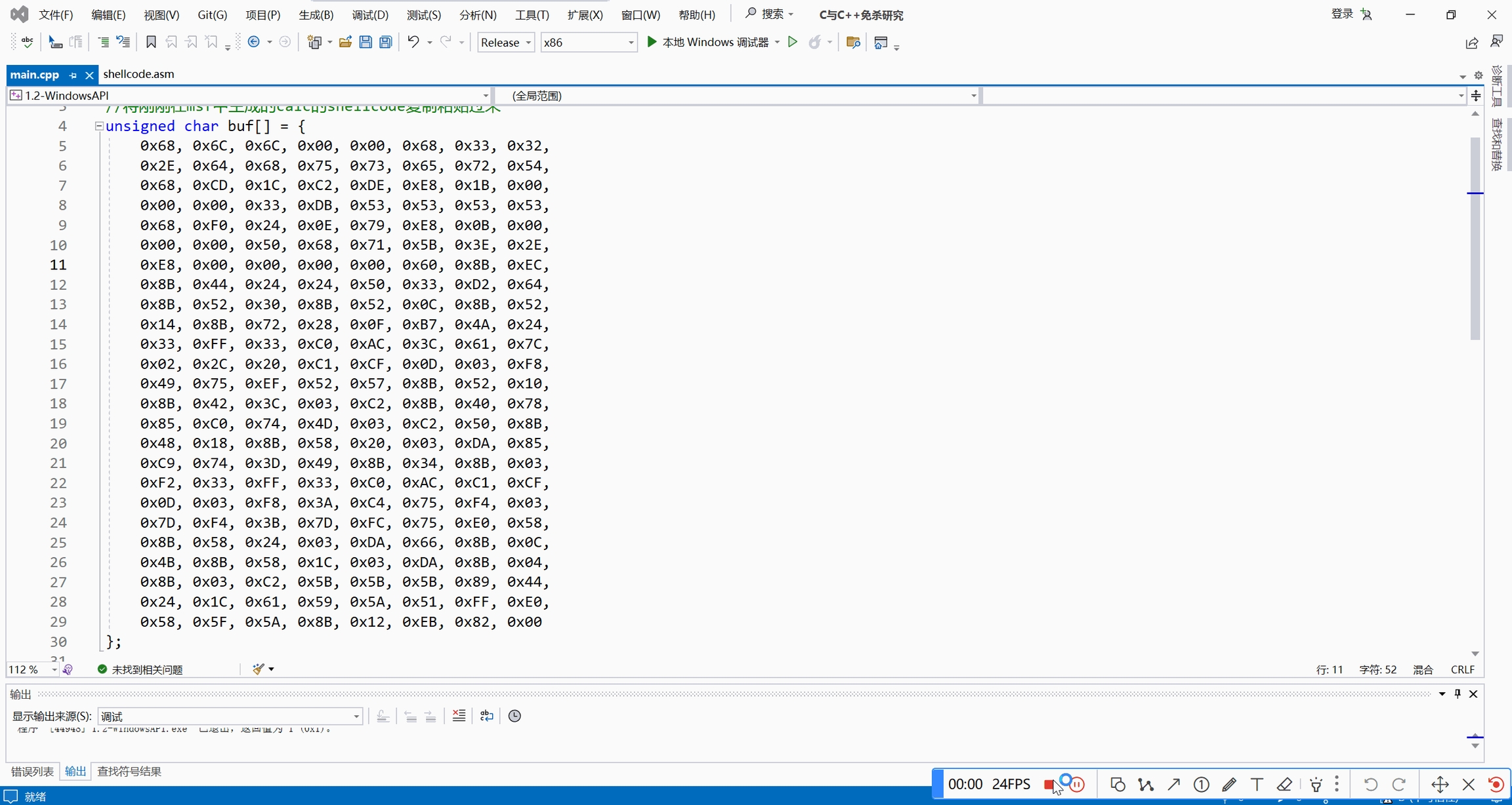 首先我们来解决第一个问题,那就是不能用全局变量或全局常量,所有用到参数都只能从栈中获取。我们就安装下面的格式来声明需要用到的字符串,这样这些字符就不会存放在.rdata中,而只会存放在栈中,也就不会出现绝对地址。