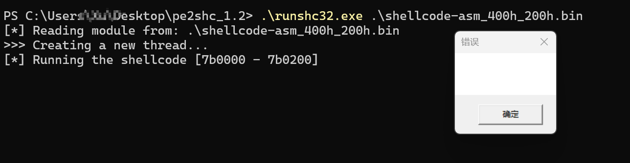 按照4.1介绍的步骤,我们提取编译后exe文件中的.text节的机器码作为我们的shellcode,然后用runshc32.exe工具运行*.bin文件。