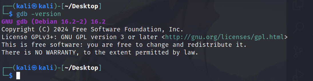 kali默认安装了GDB调式工具,可以用命令查看一下 gdb -version