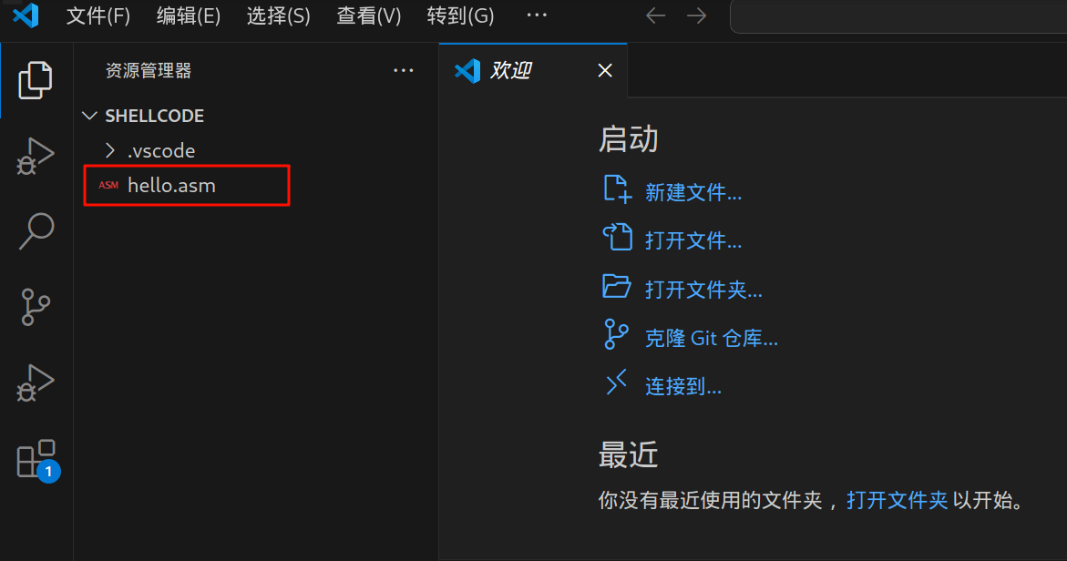 首先创建一个工作目录,随后用vscode打开,然后在工作目录添加一个hello.asm文件