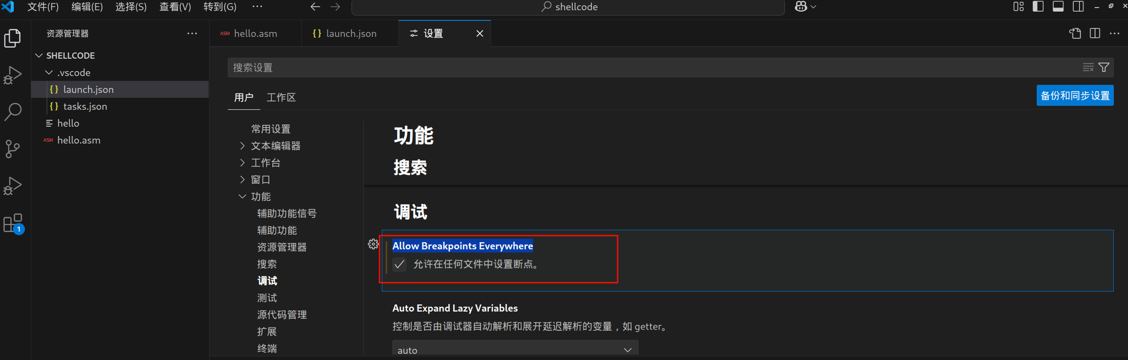 正常来说vscode只允许特定的文件下断点,为了给我们的asm文件下断点,就需要在设置->调式->勾选Allow Breakpoints Everywhere,这样我们就可以下断点啦。