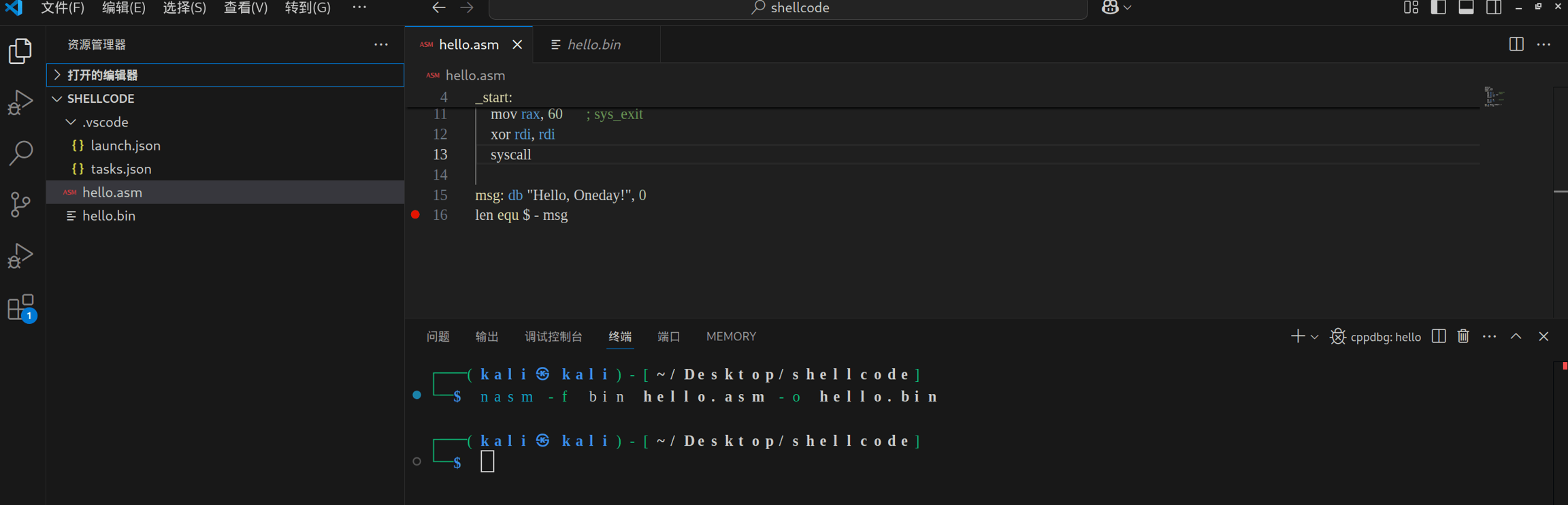 接下来我们根据shellcode.asm直接生成shellcode.bin