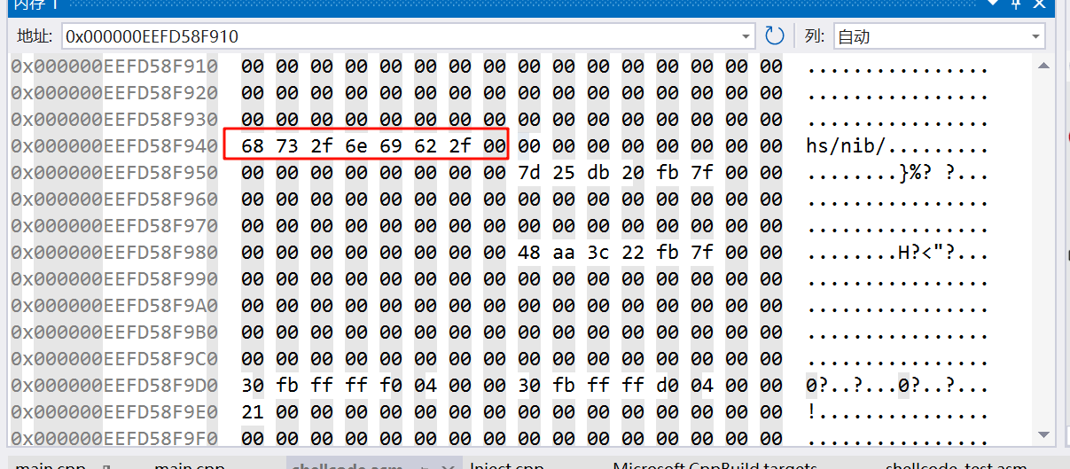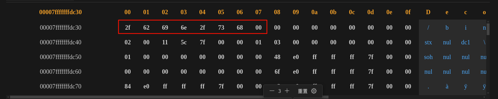 在linux shellcode开发中,我使用 mov rdi, '/bin/sh' 来定义字符串,然后将字符串压入栈中,如下图所示