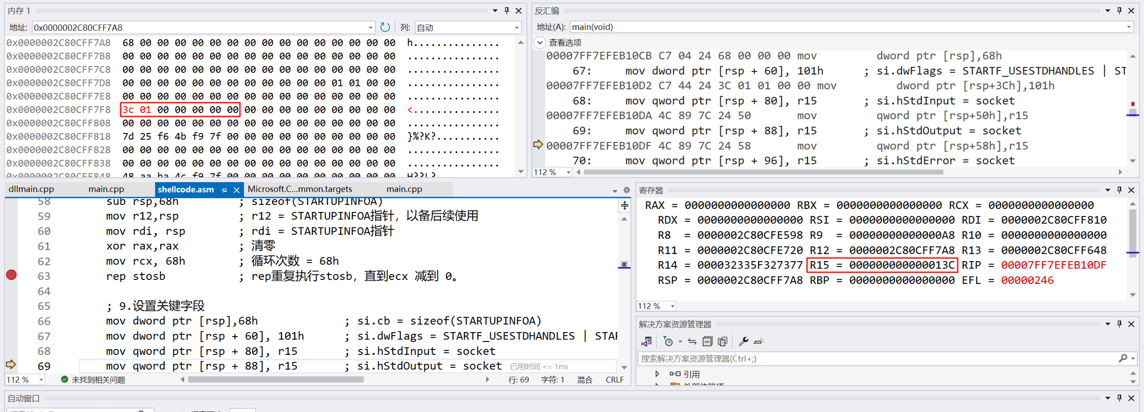 si.hStdInput = socket,socket的句柄保存在r15中,接下来的si.hStdOutput = socket和si.hStdError = socket也是同样的方法调式。