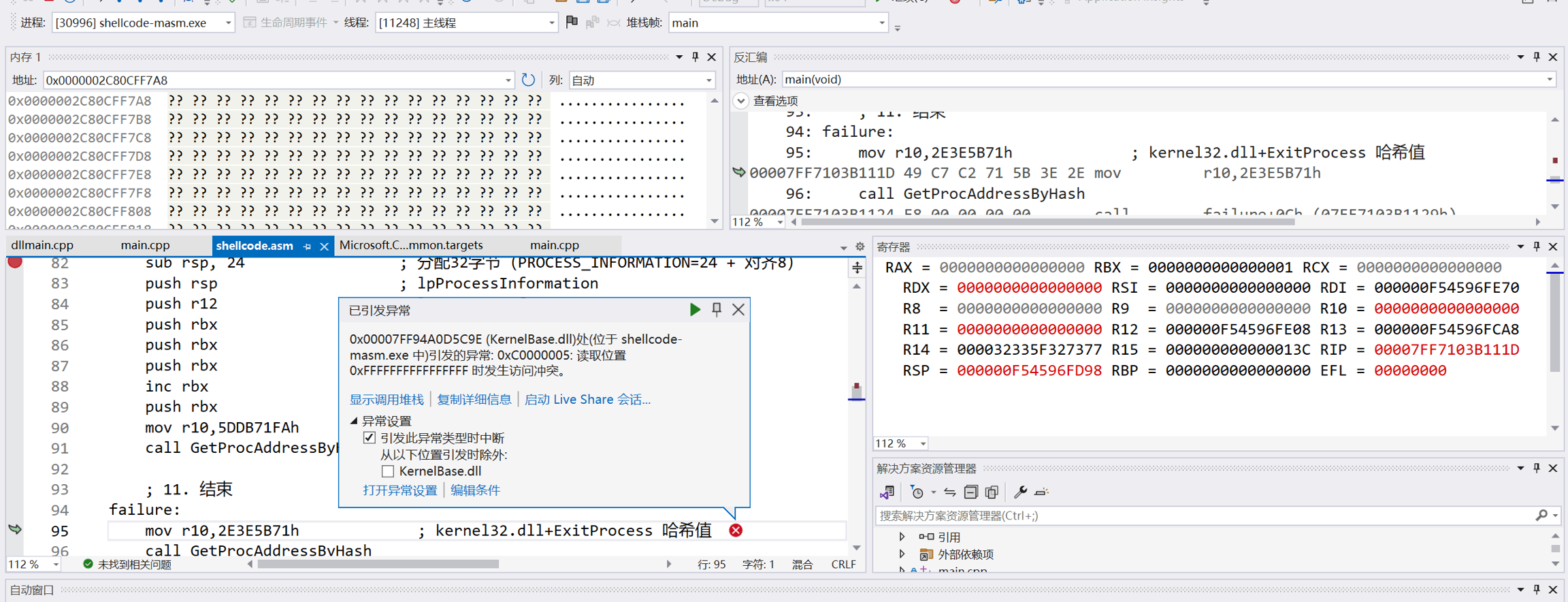 一切准备就绪后,我们来到hello.asm界面,在 mov rax, 1 ; sys_write 处下一个断点,按住快捷键:F5进行快速调式,如果一切顺利,程序会停在断点处,我们可以查看寄存器的值,也可以查看内存的情况。