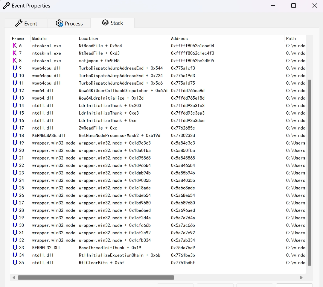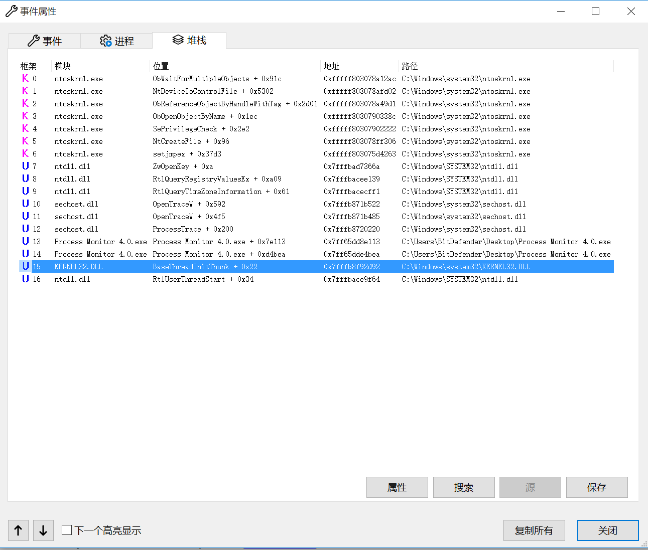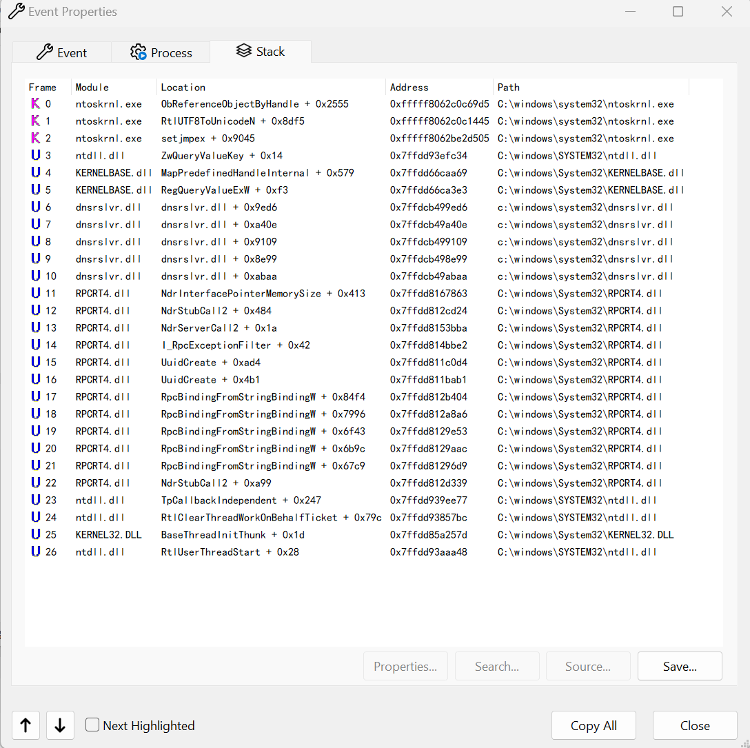 process monitor 随便打开一个线程的调用堆栈,很好地证明了上述所说的内容。下图是win11 64位某线程的调用栈