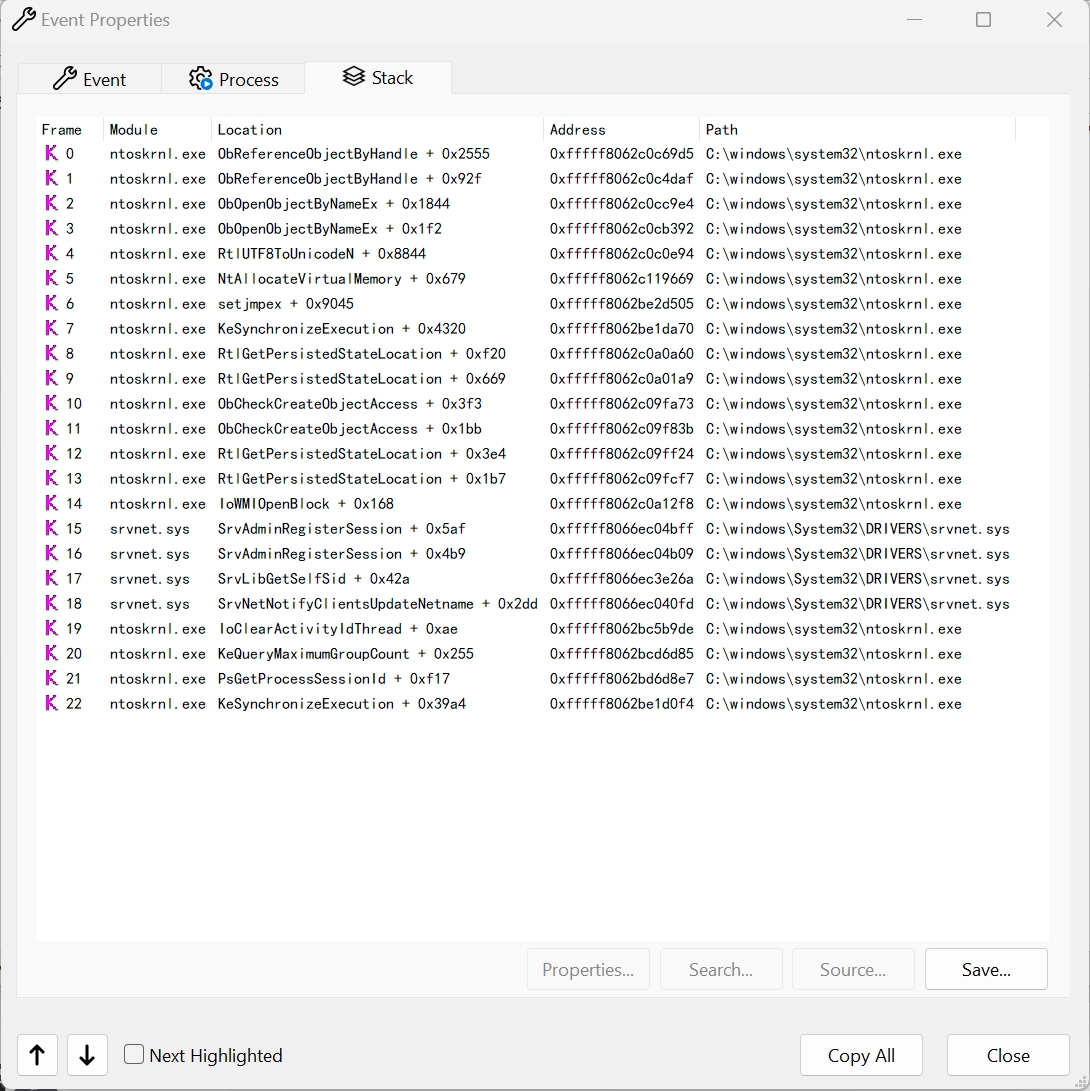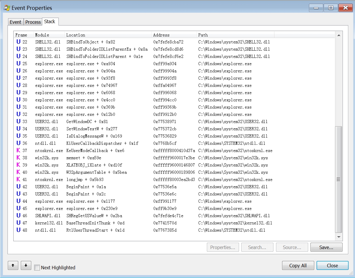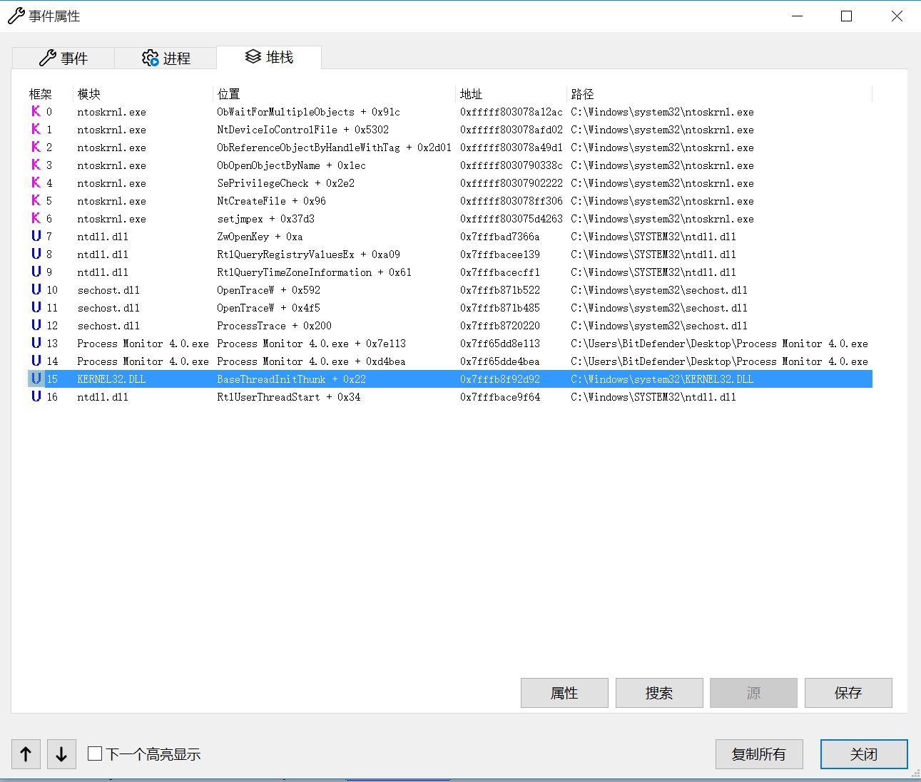 process monitor 随便打开一个线程的调用堆栈,很好地证明了上述所说的内容。下图是win11 64位某线程的调用栈