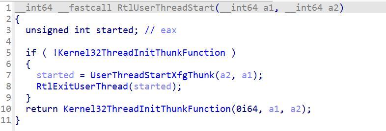 Kernel32ThreadInitThunkFunction不存在(je跳转至ntdll!RtlUserThreadStart+0x2a),直接调用UserThreadStartXfgThunk,并最终通过RtlExitUserThread退出线程如果不为空,则调用