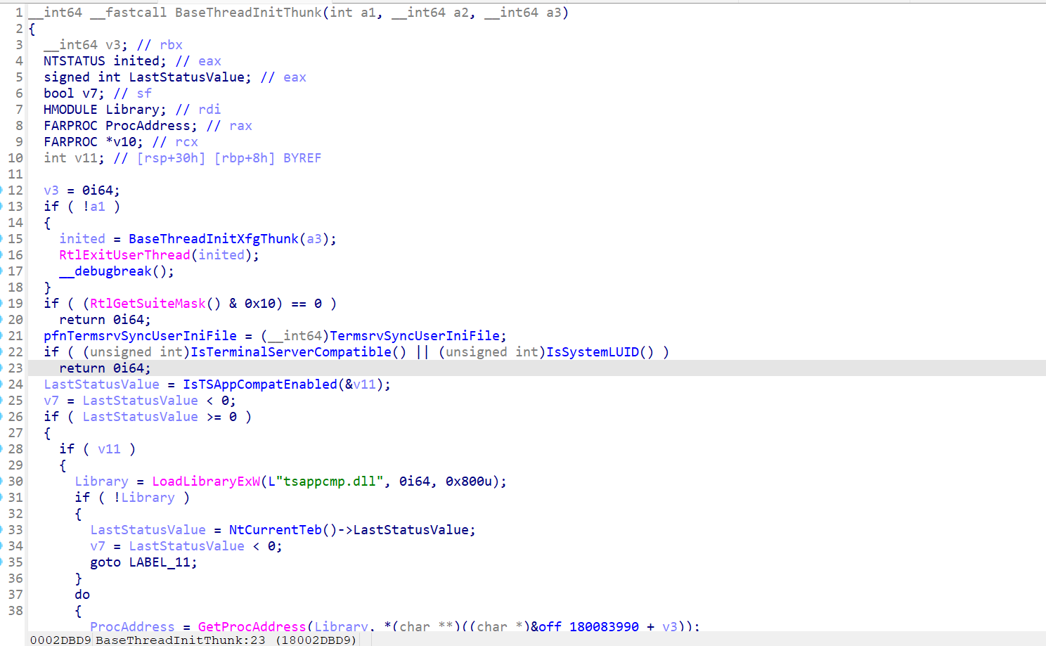 a1 == 0):用于验证间接函数调用的目标地址是否合法,调用BaseThreadInitXfgThunk启动线程并退出。终端服务安全策略:若为终端服务环境,初始化兼容性函数,再执行用户代码