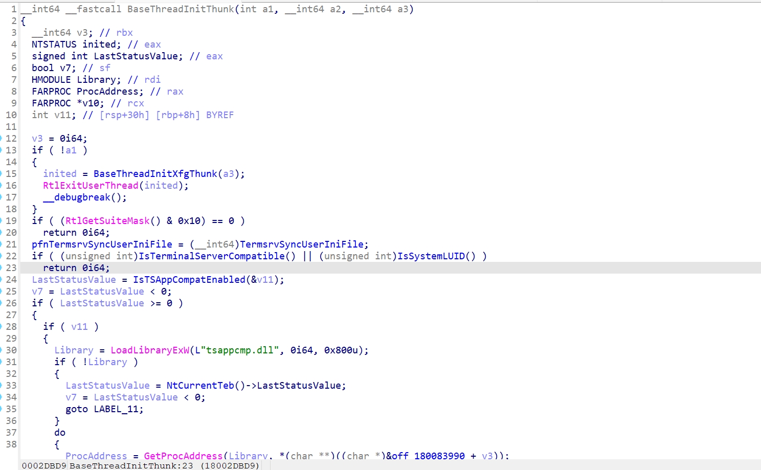 因为 Kernel32ThreadInitThunkFunction(0, a1, a2) 的第一个参数为0,即 BaseThreadInitThunk(int a1, __int64 a2, __int64 a3) 中的a1为0,代码执行流程实际会走XFG 安全路径,最终会调用 KERNEL32!BaseThreadInitXfgThunk 启动用户线程。