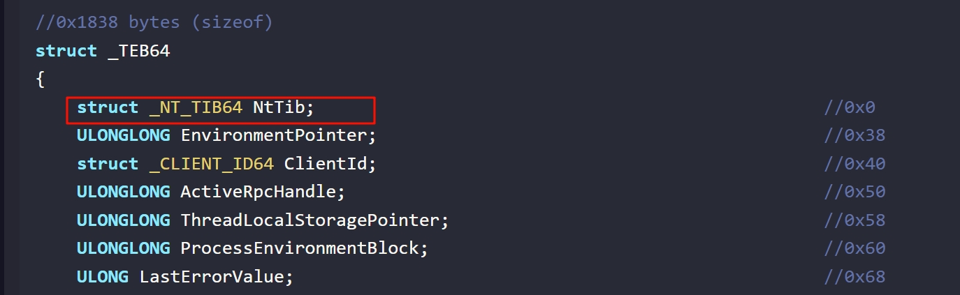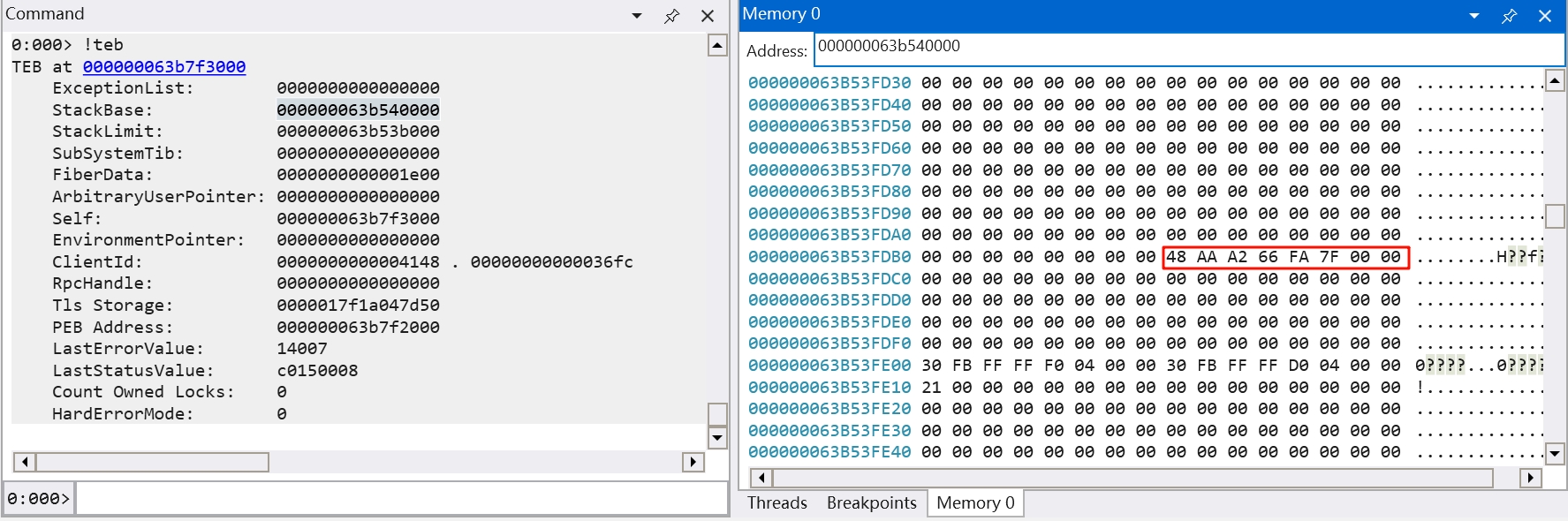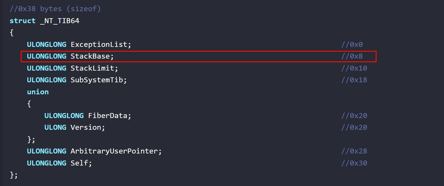 GS寄存器存储着TEB数据结构的指针,而GS寄存器偏移0x8(即 gs:[0x8])的位置就是线程的栈基址,在参考文章中,大佬是可能是通过x64dbg获取栈基址然后往上翻找,最后确定存储着两个返回地址的位置。