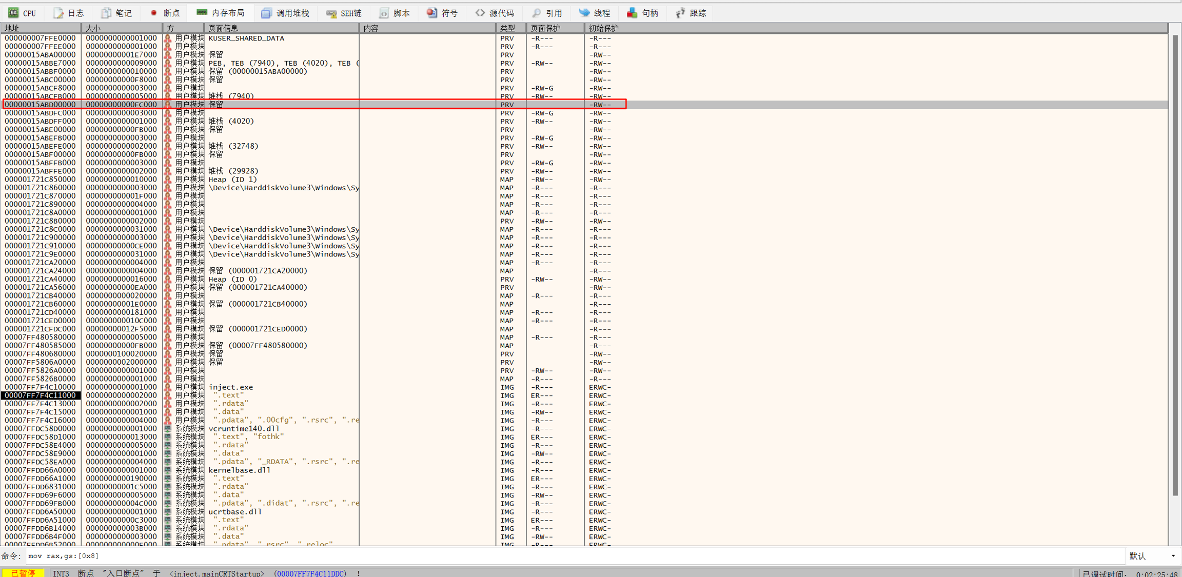 不知道什么原因,我不能查看StackBase栈上的内容,各位师傅可以尝试一下,在x64dbg命令行中输入:mov rax,gs:[0x8],栈基址存放在rax中。 然后我想跳转到StackBase的时候不允许我这么做