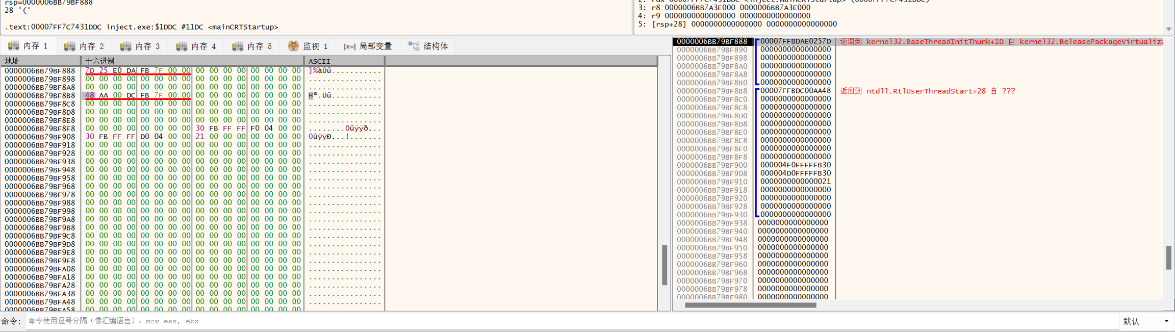 还有一个问题如果通过代码实现,就是栈上这么多值,我怎么知道那个是返回地址。其实还是有一些特点的,即使开启了ASLR,模块 kernel32 和 ntdll 的 .text 节通常会在加载基址后的一个相对固定的位置,一般为7ffxxxxxxxxx。按照调用栈的顺序,第一个返回地址是指向kernel32.dll中的某个 BaseThreadInitThunk 的某条指令,而第二个返回地址是指向ntdll.dll中的 RtlUserThreadStart 的某条指令。