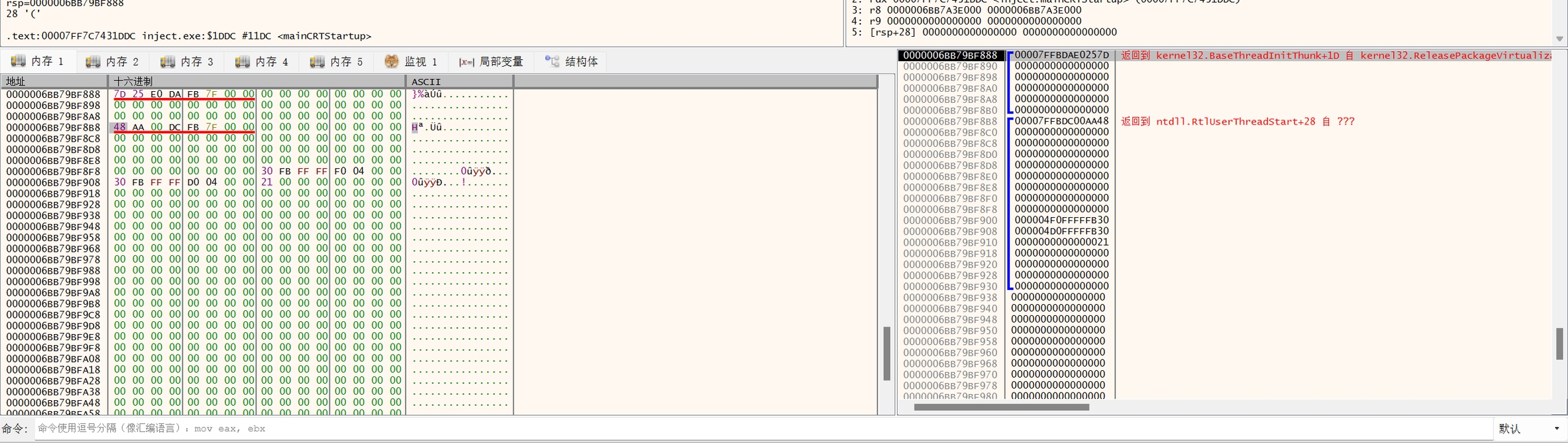 HardErrorMode: 0接着跳转到StackBase,跳转之后,我们往上翻找,这两个返回地址在较低地址处,因为栈指针RSP压栈的时候是往低地址的方向扩展。此时的程序未完成初始化,故stackbase所指向的栈空间没有留下返回地址