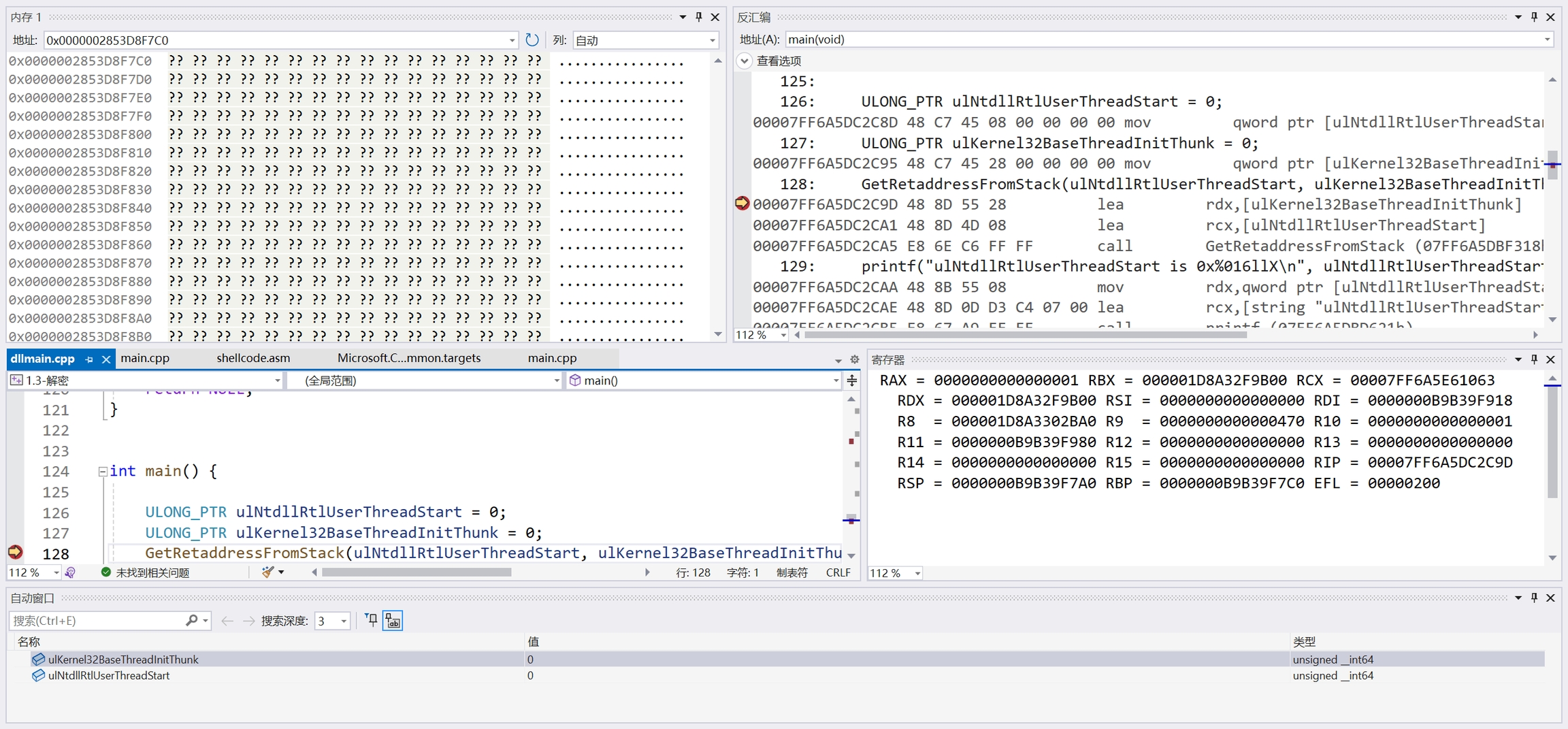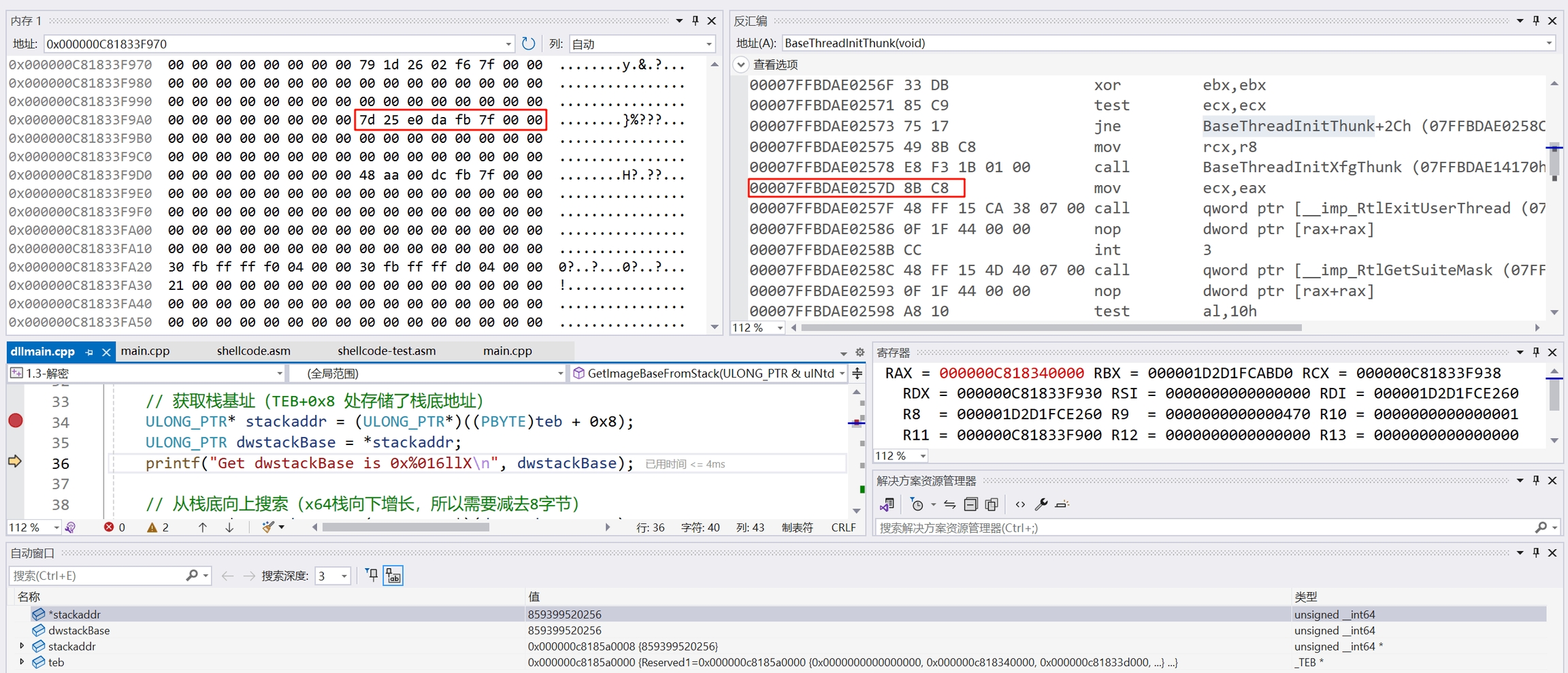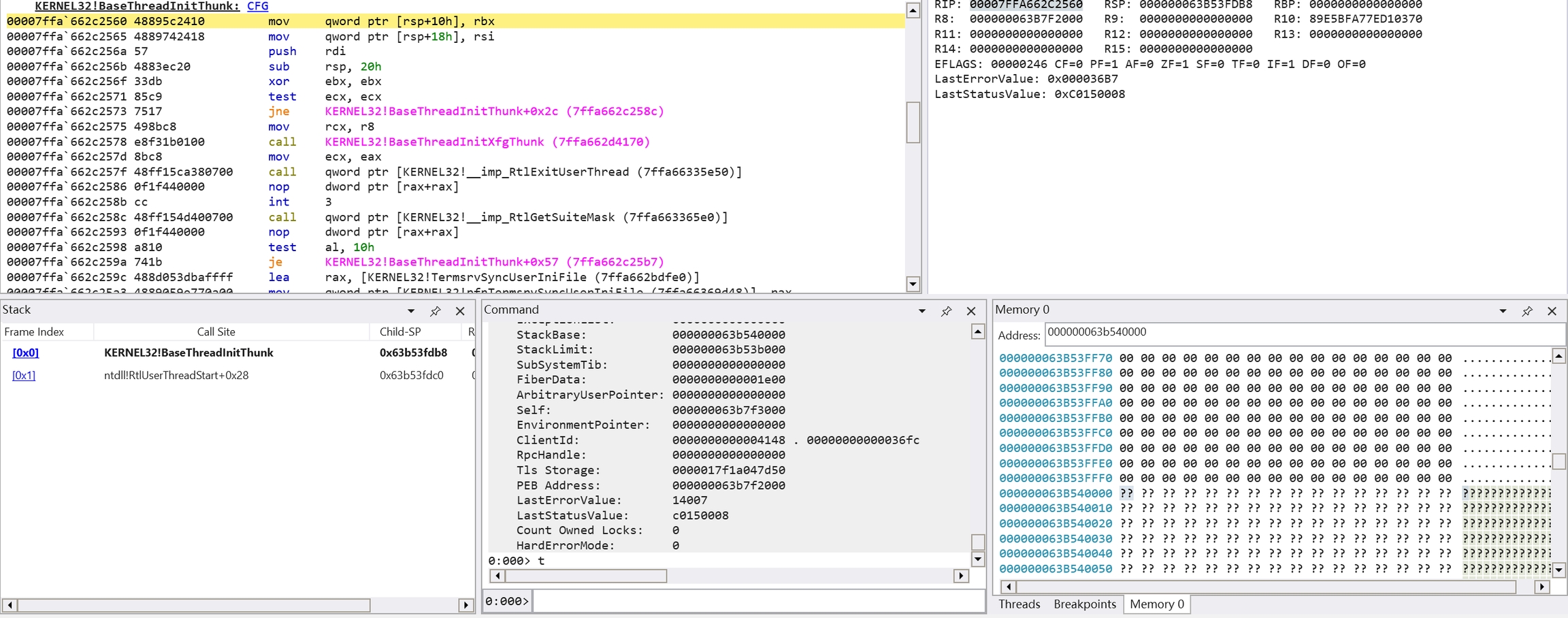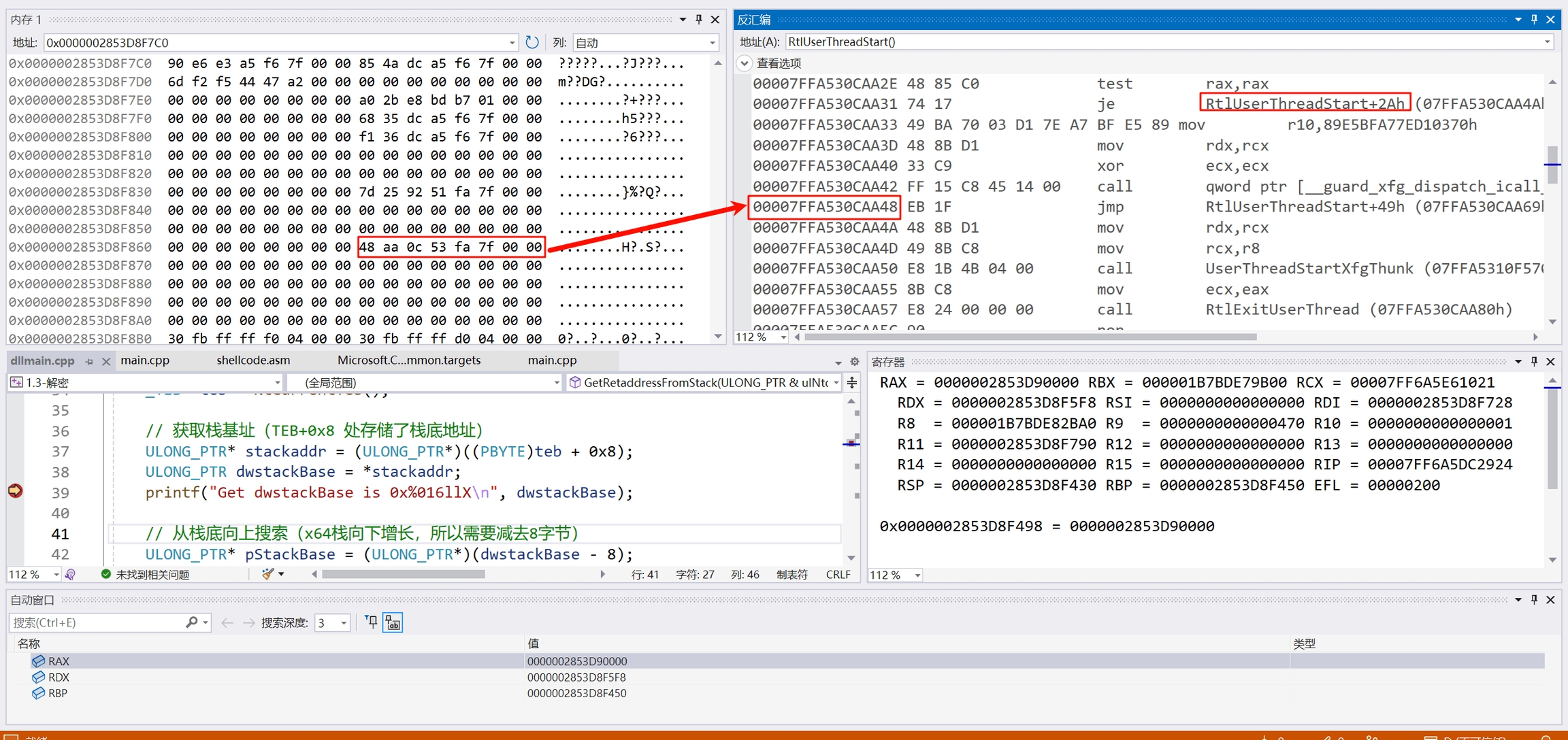 总结:通过上面的分析可以了解到,大多数64位线程在启动时最开始都会有 call kernel32!BaseThreadInitThunk 和 call KERNEL32!BaseThreadInitXfgThunk,第一个call会将 RtlUserThreadStart 中的下一条指令压栈,而第二个call会将 BaseThreadInitThunk 中的下一条指令压栈,这是此项技术关键,证明了技术的可行性。