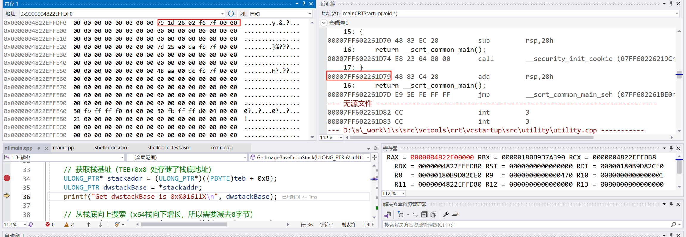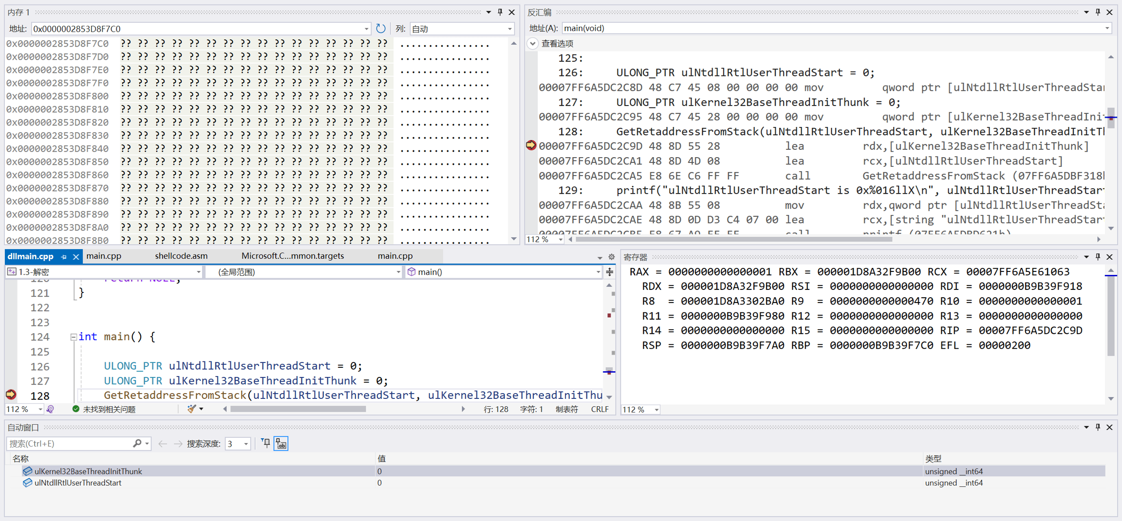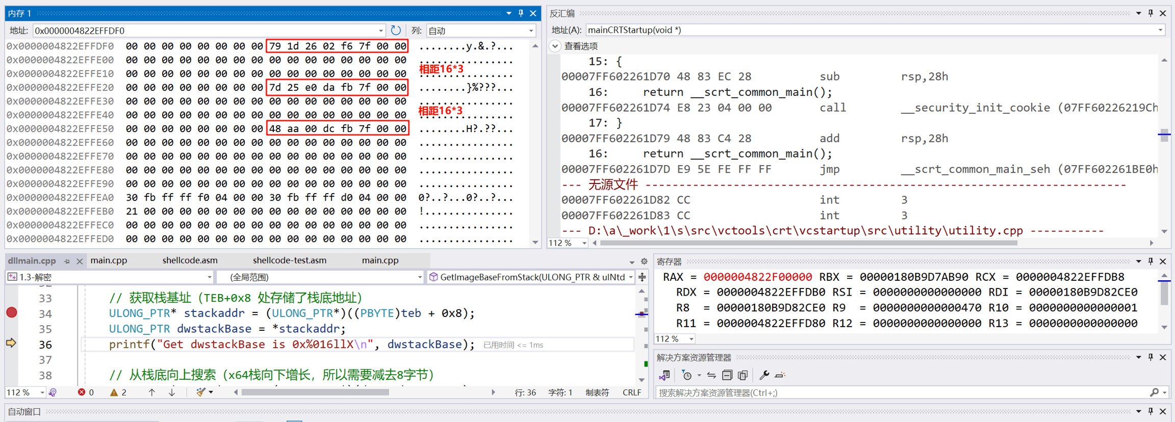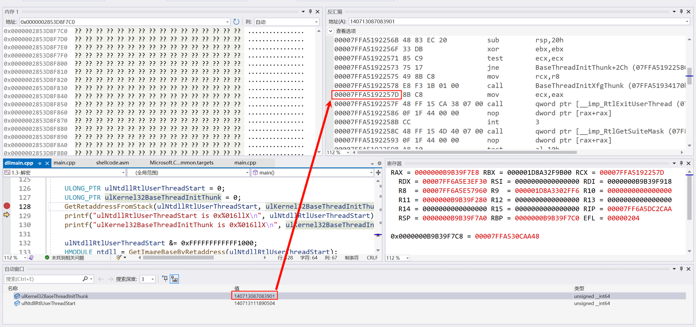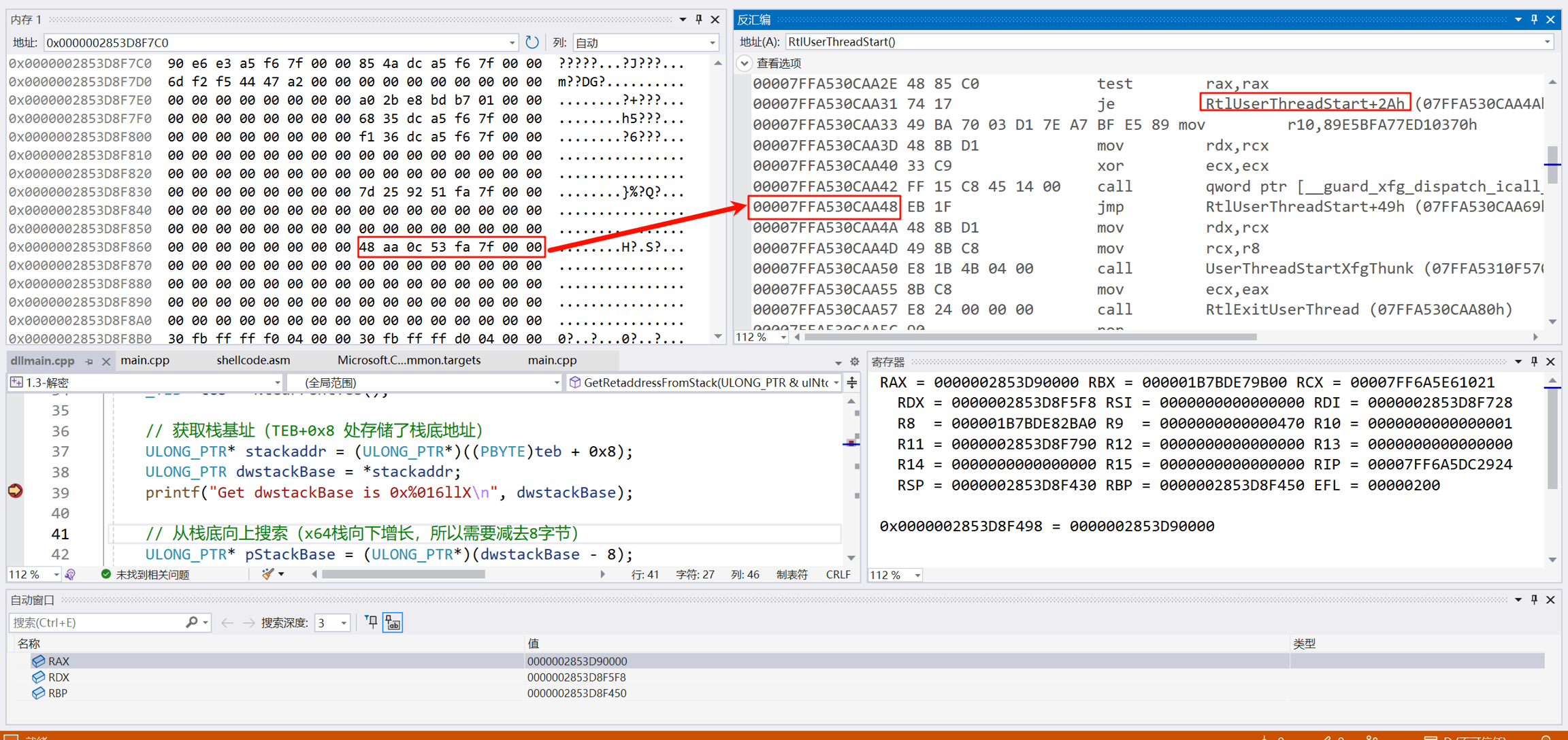 GetRetaddressFromStack:通过栈回溯获取 ntdll!RtlUserThreadStart 和 kernel32!BaseThreadInitThunk 的地址GetImageBaseByRetaddress:通过函数地址逆向查找所属DLL的基地址GetApiAddressByName:通过解析PE导出表动态获取指定API的函数地址