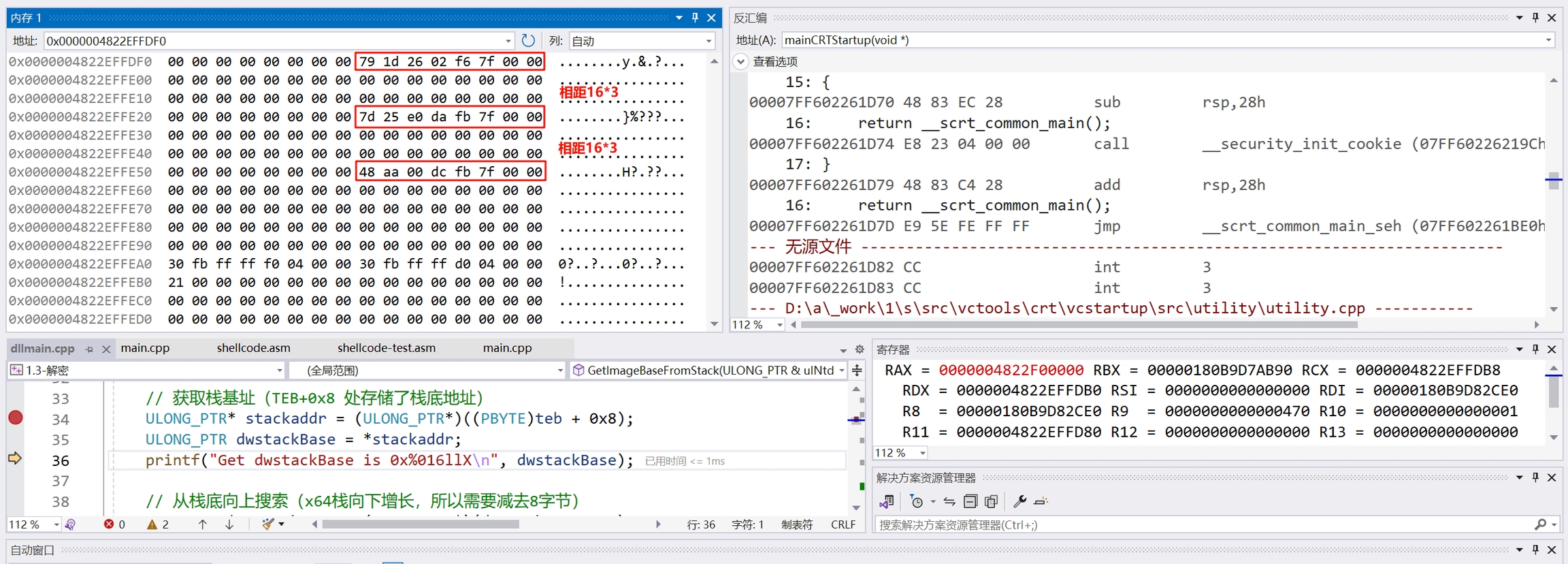 此处的动态调试是为了验证当程序运行到用户自定义入口点(main或者mainCRTStartup)时栈基址的情况,并进一步分析线程启动时的调用链