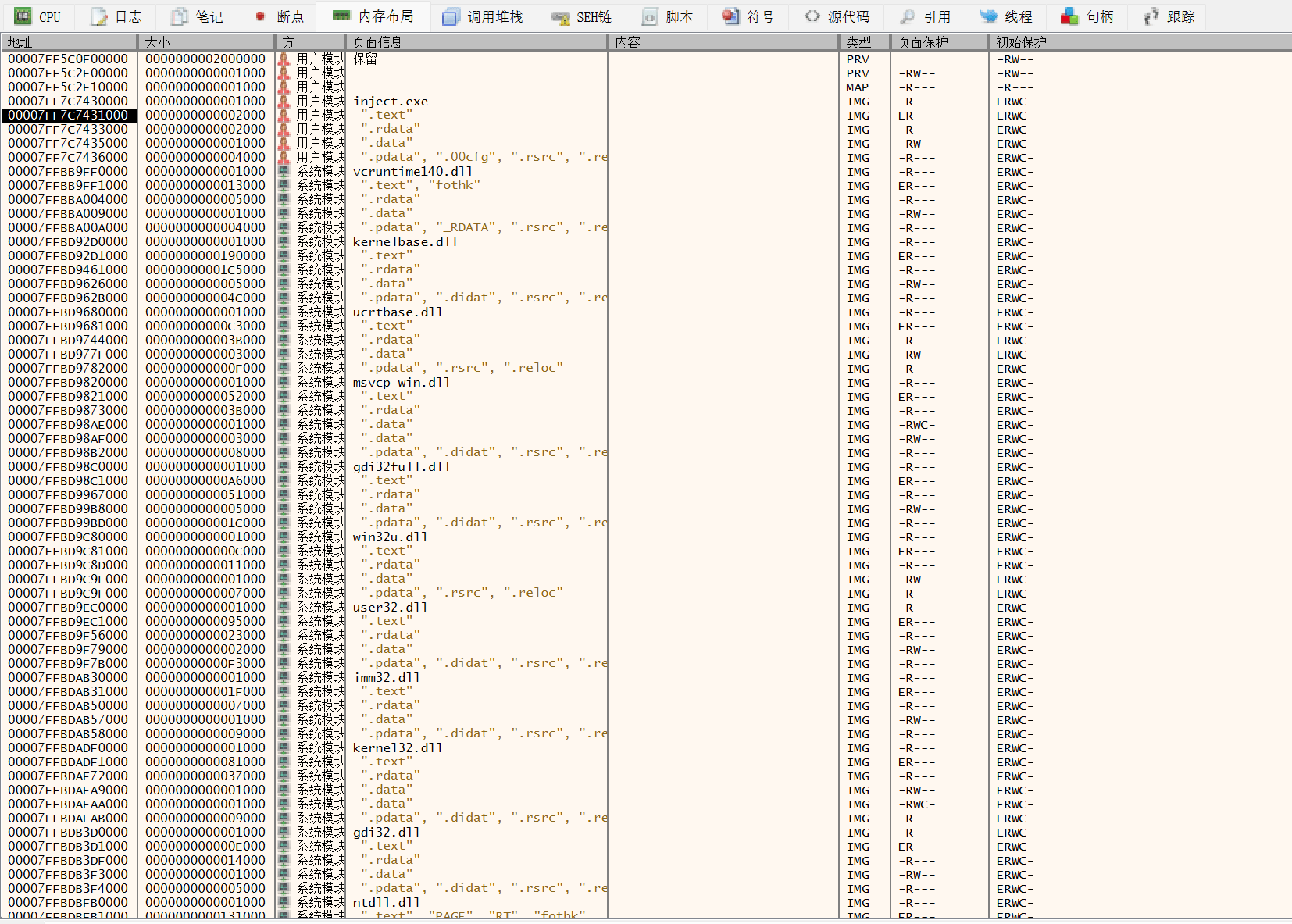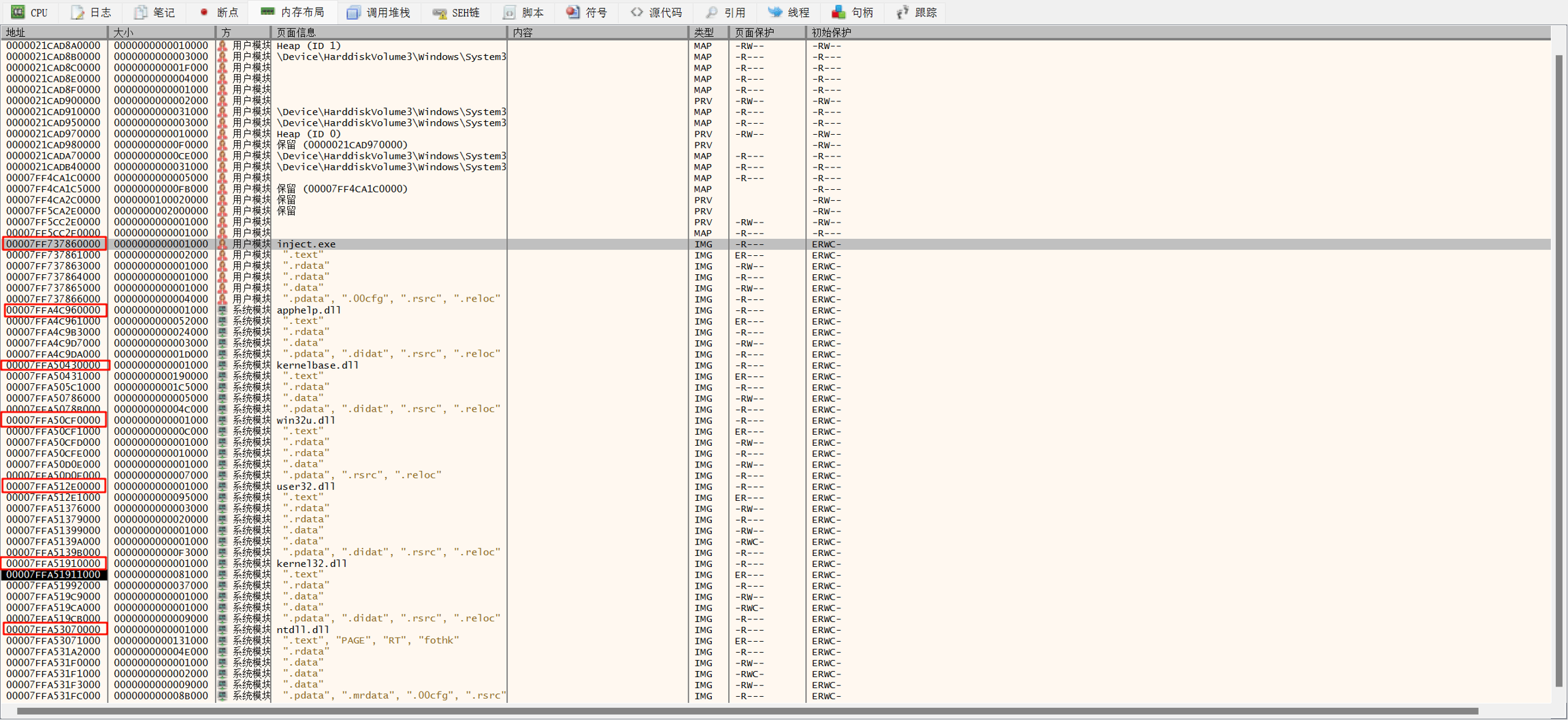 怎么验证?很简单,我们用x64dbg随便打开一个exe文件,查看内存布局,我们除了观察查看各个PE文件的基址外,还可以观察每个PE文件的大小都是0x1000的整数倍,所以按0x1000步长绝对是可以找到DOS头和NT头的。