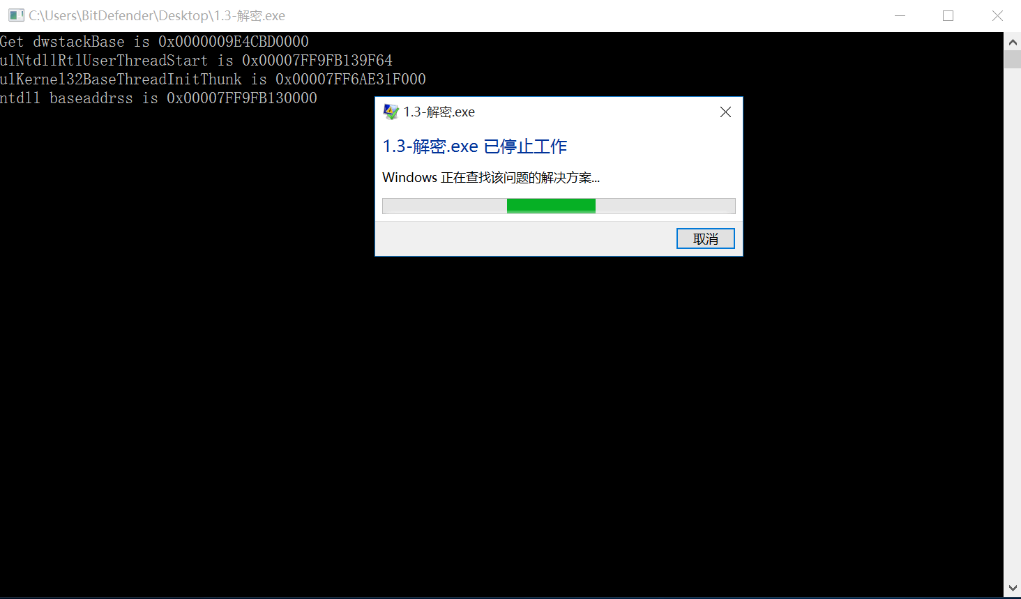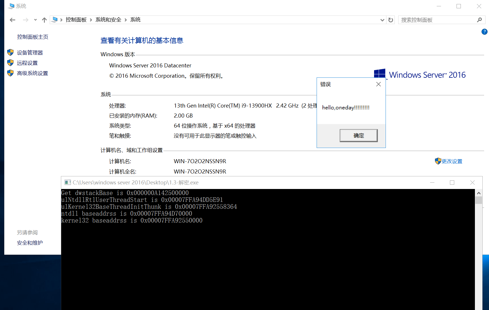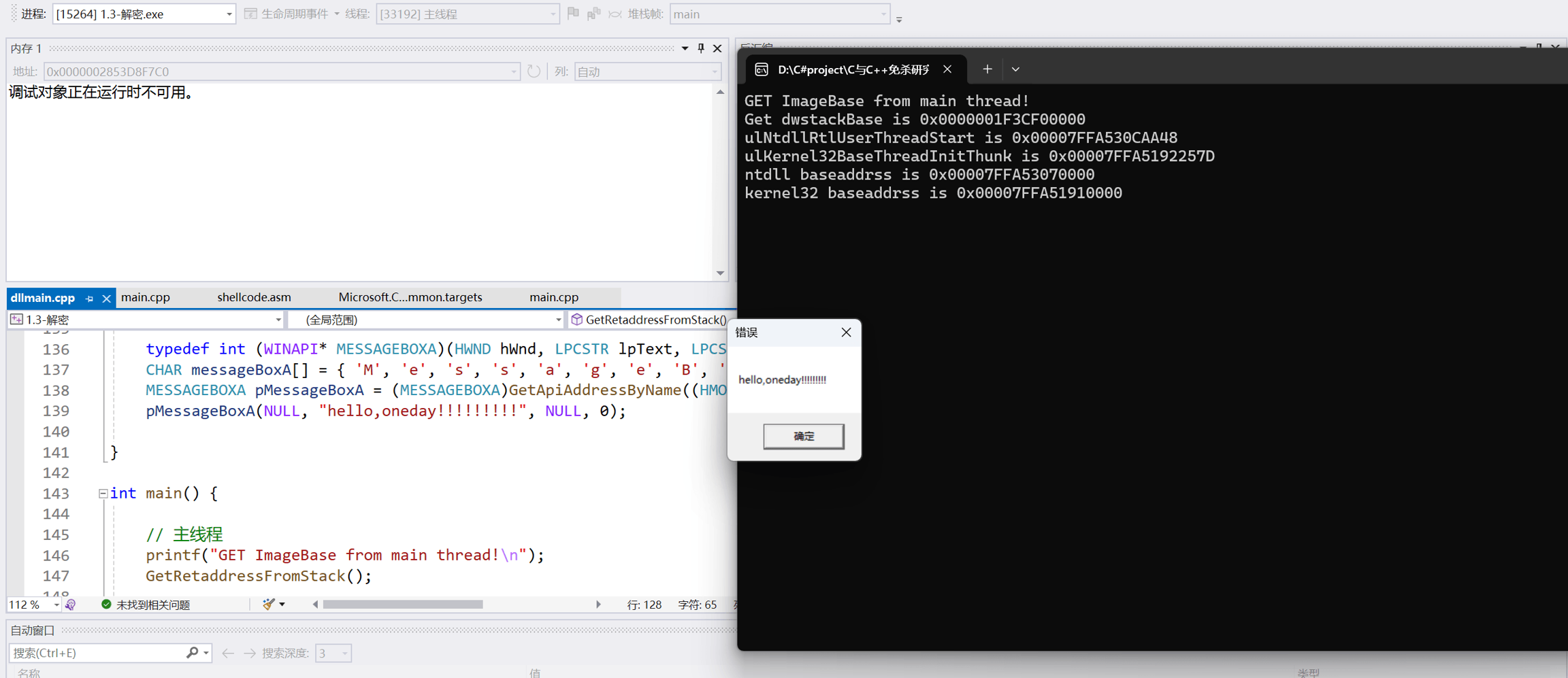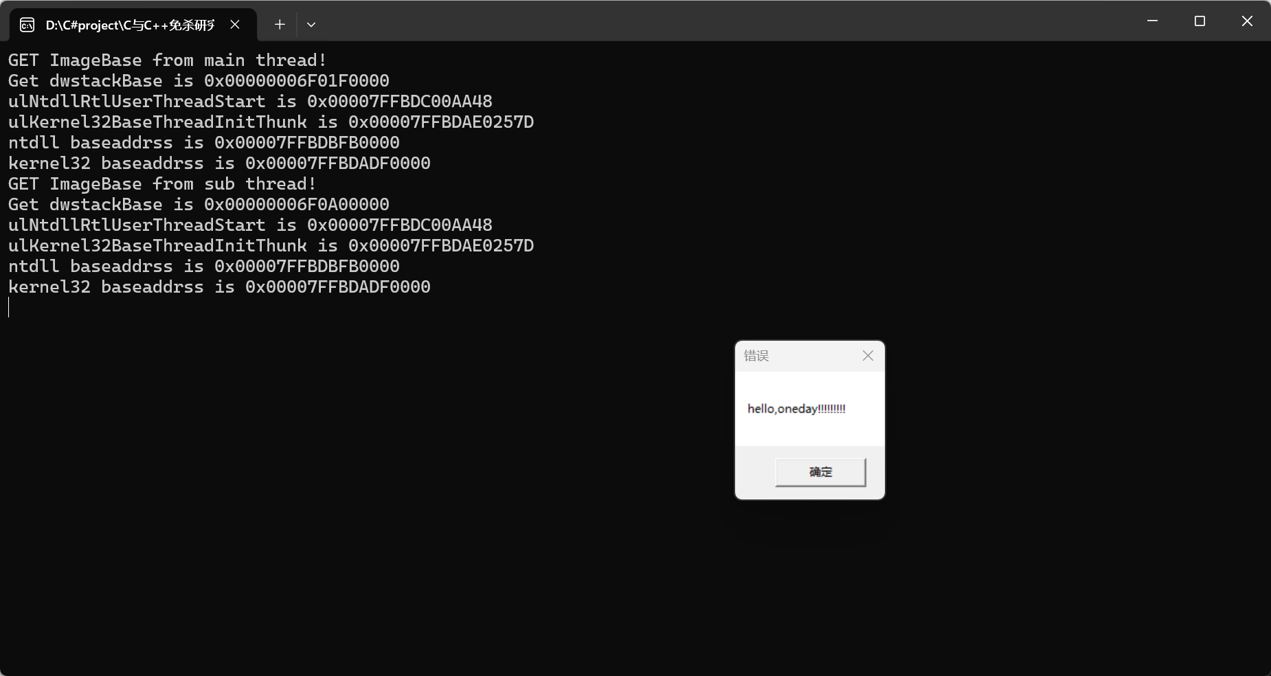 主要是验证子线程是否能通过本章介绍的方法获取模块基址,代码逻辑进行了部分修改,因为CreateThread只能让要启动线程带一个参数,且无直接返回值。